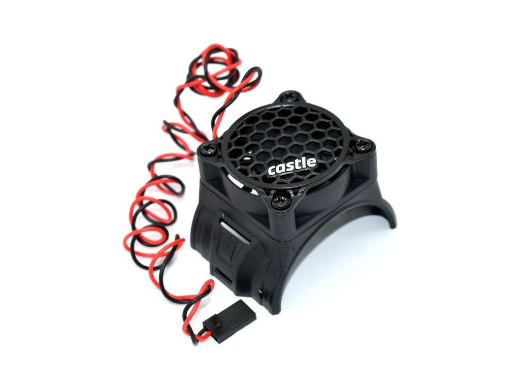 Castle aktivní chladič s ventilátorem o rozměrech - 40 x 40 x 7 mm. Pro motory o vnějším průměru 46 mm, jako například řada Castle 17xx. Snadná instalace pomocí stahovacích pásků. Napájení z přijímače (max.8.4 V). Maximální otáčky 10 000 ot/min.