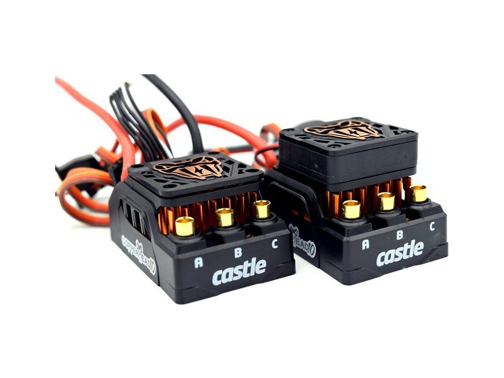 Výkonný regulátor Castle Copperhead se střídavým senzorovým motorem 1410 3800ot/V, pro RC modely aut 1:10 do hmotnosti 3 kg. Voděodolná konstrukce, nastavitelný BEC až 6A, napájení 2S-3S LiPol, možnost nastavení, telemetrie S.BUS2, základní data log. Technologie CRYO-DRIVE.