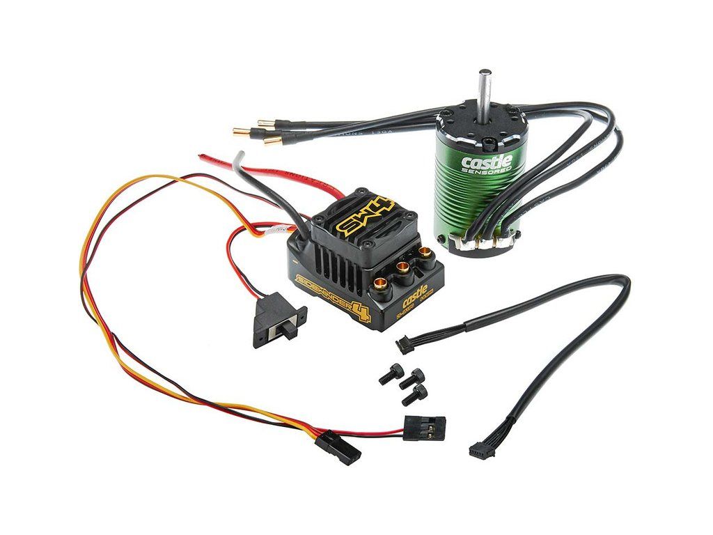 Střídavý senzorový motor Castle 1410 3800 ot/V s hřídelí 5 mm a regulátorem Castle Sidewinder 4 Cryo-Drive. Sada je určena pro 2WD/4WD Buggy, Truggy, Short Course nebo 2WD Monster Trucky.