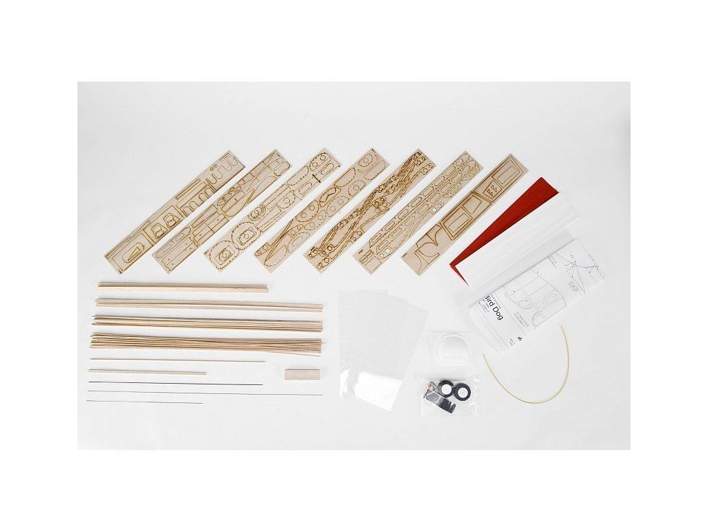 Stavebnice obsahuje: balsové laserem vyřezávané díly, balsové nosníky, vakuově lisované díly (kryt motoru...), čirou plastovou fólii na "zasklení" kabiny, ocelovou strunu na podvozek a další drobné díly, lehká pěnová kola, barevný potahový papír, aršík samolepek, stavební plán.