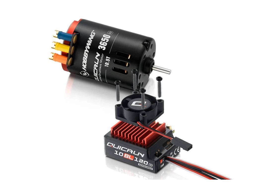Combo obsahuje: regulátor QUICRUN 10BL120 Sensored G2 s kabely, střídavý senzorový motor QUICRUN 3650SD G2,návod k obsluze.