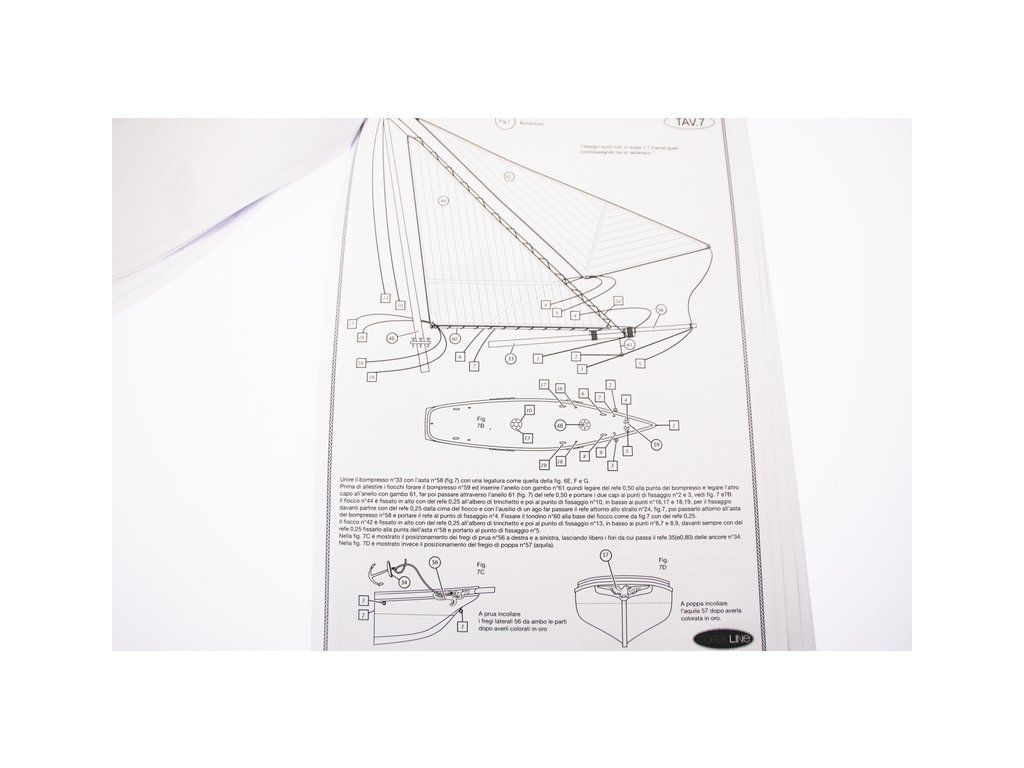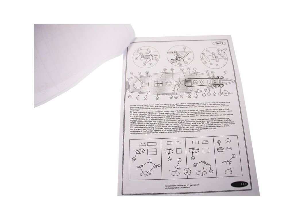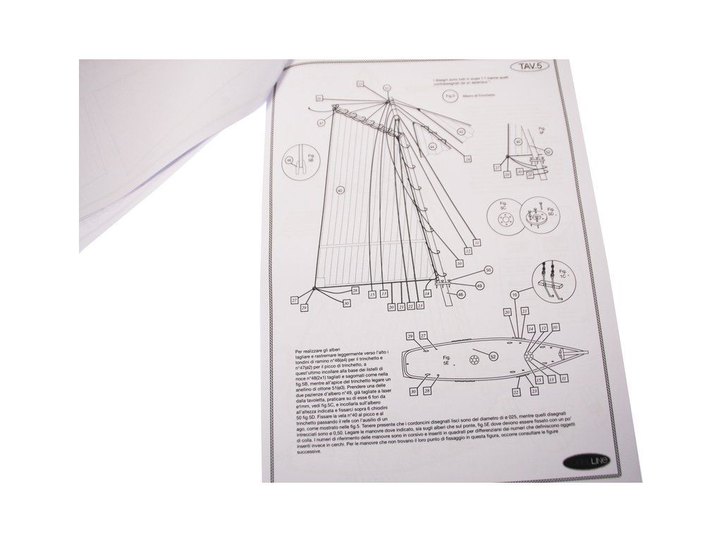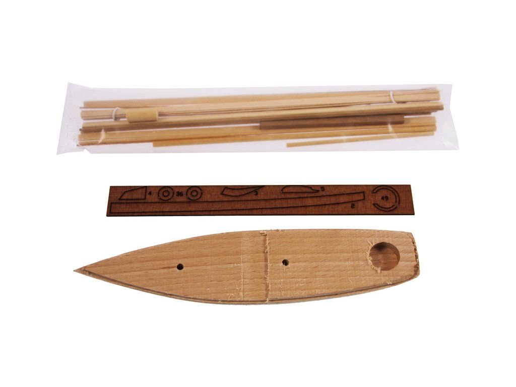 Balení obsahuje sadu překližkových dílů, sadu dřevěných lišt o různém průřezu, sáček s drobnými díly, sadu výkresů a vícejazyčný manuál.