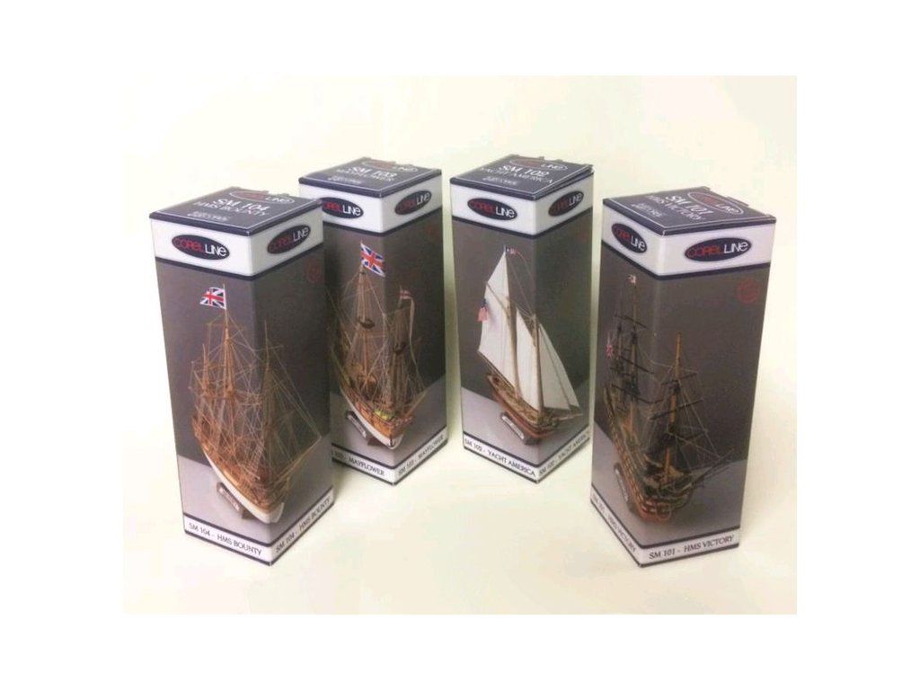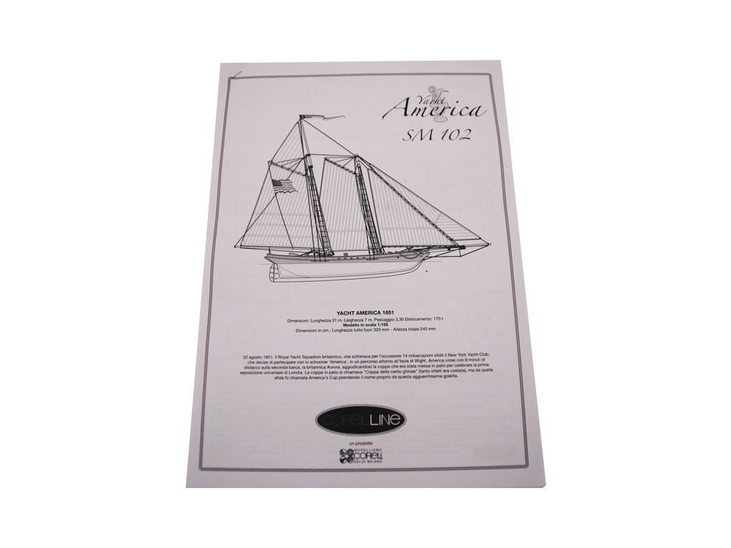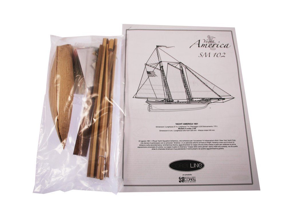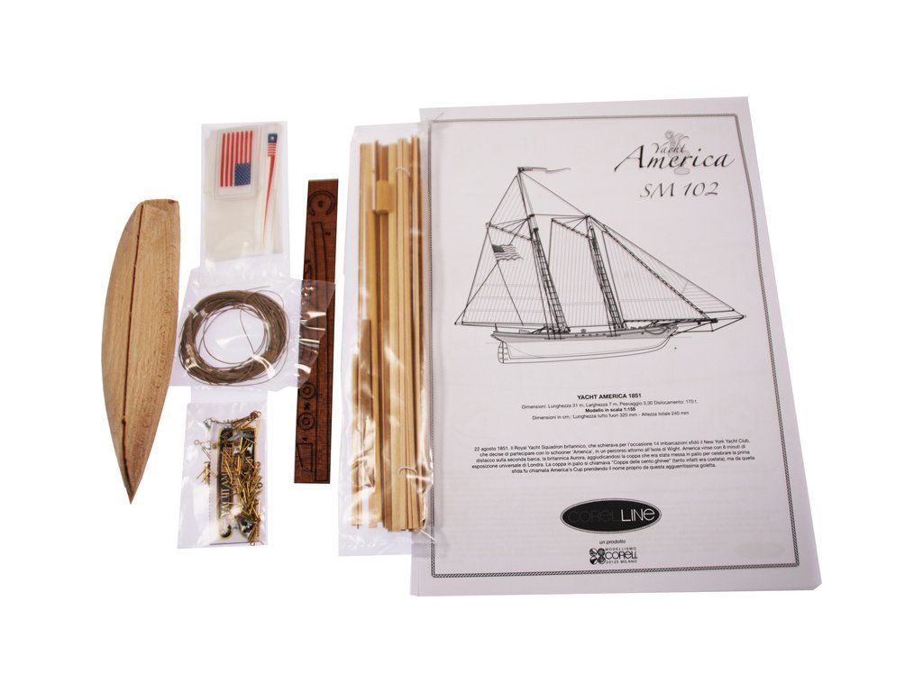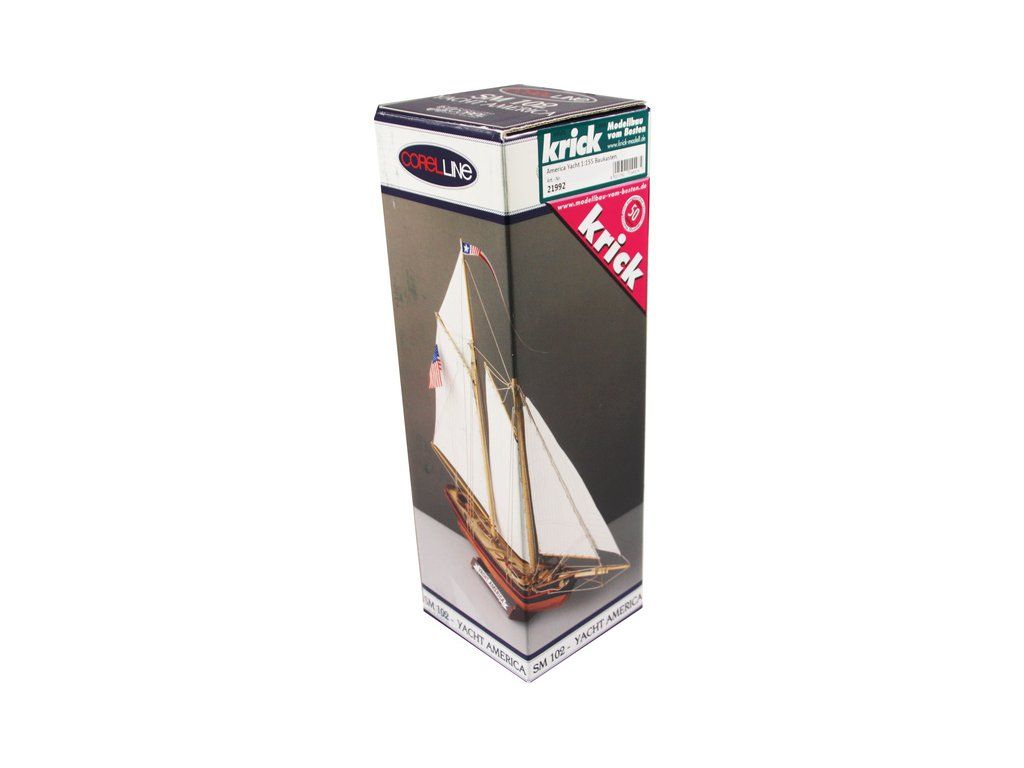 Stavebnice neplovoucího modelu COREL America Yacht v měřítku 1:155 z roku 1805. Jachta Amerika byla postavena v r. 1851 v loděnici William Brown v New Yorku. 22. srpna absolvovala vítězně památný závod kolem ostrova Wight. V balení jsou dřevěné díly, lišty a množství kování, příslušenství, plány atd.