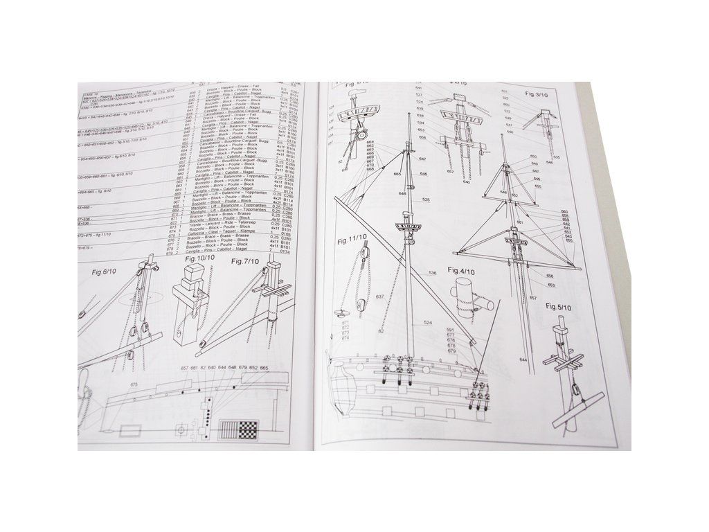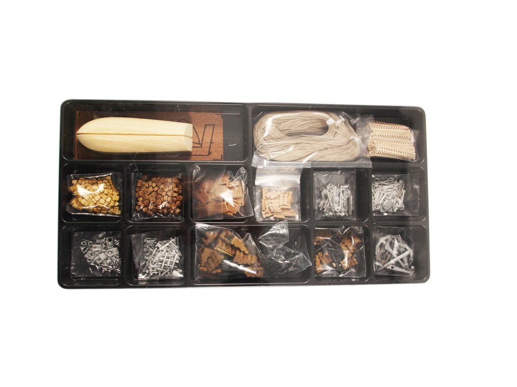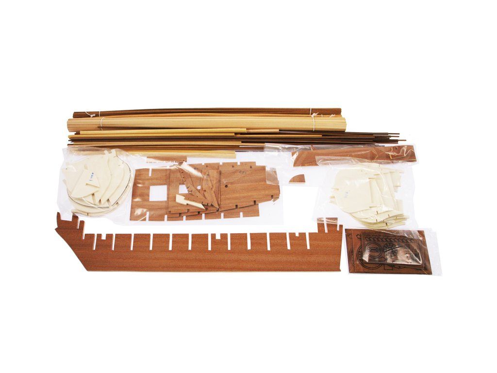 Balení obsahuje sadu překližkových dílů, sadu dřevěných lišt o různém průřezu, blistr s drobnými díly, díly z mosazi, sadu výkresů a vícejazyčný manuál.