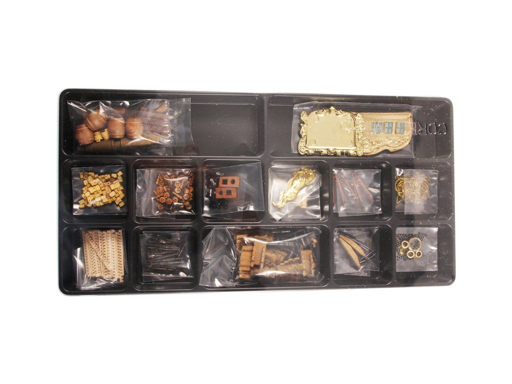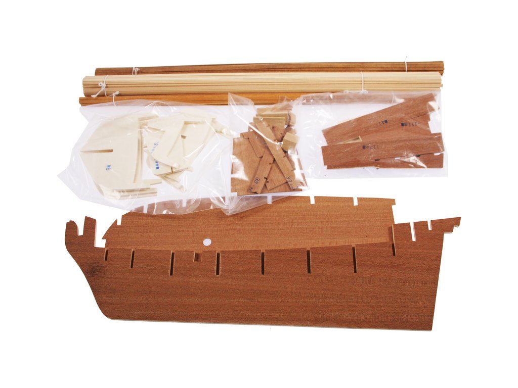 Balení obsahuje sadu překližkových dílů, sadu dřevěných lišt o různém průřezu, blistr s drobnými díly, díly z mosazi, sadu výkresů a vícejazyčný manuál.