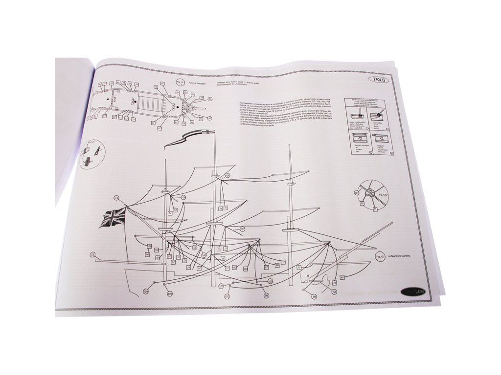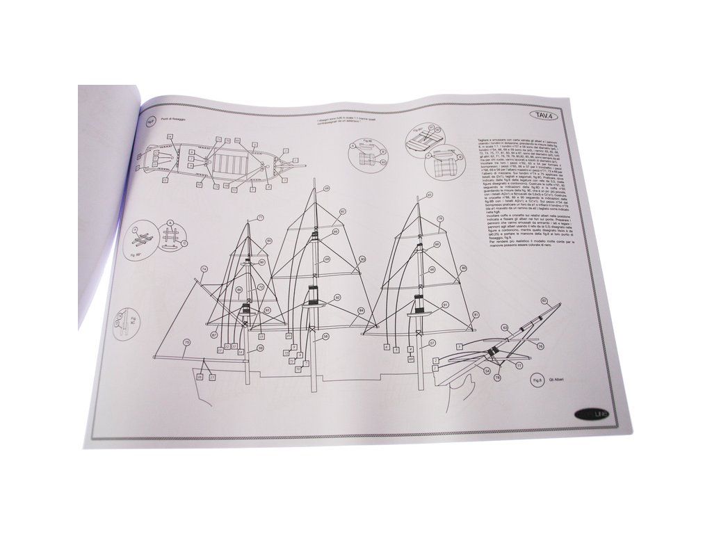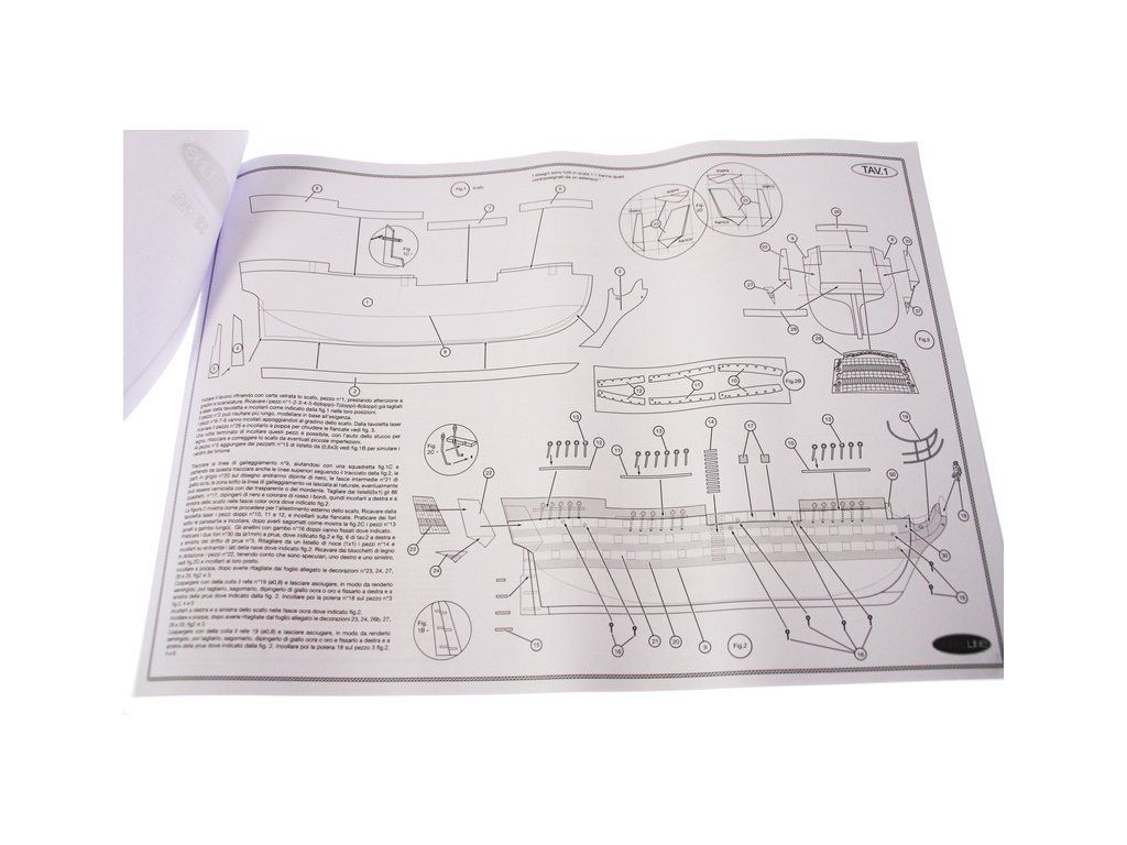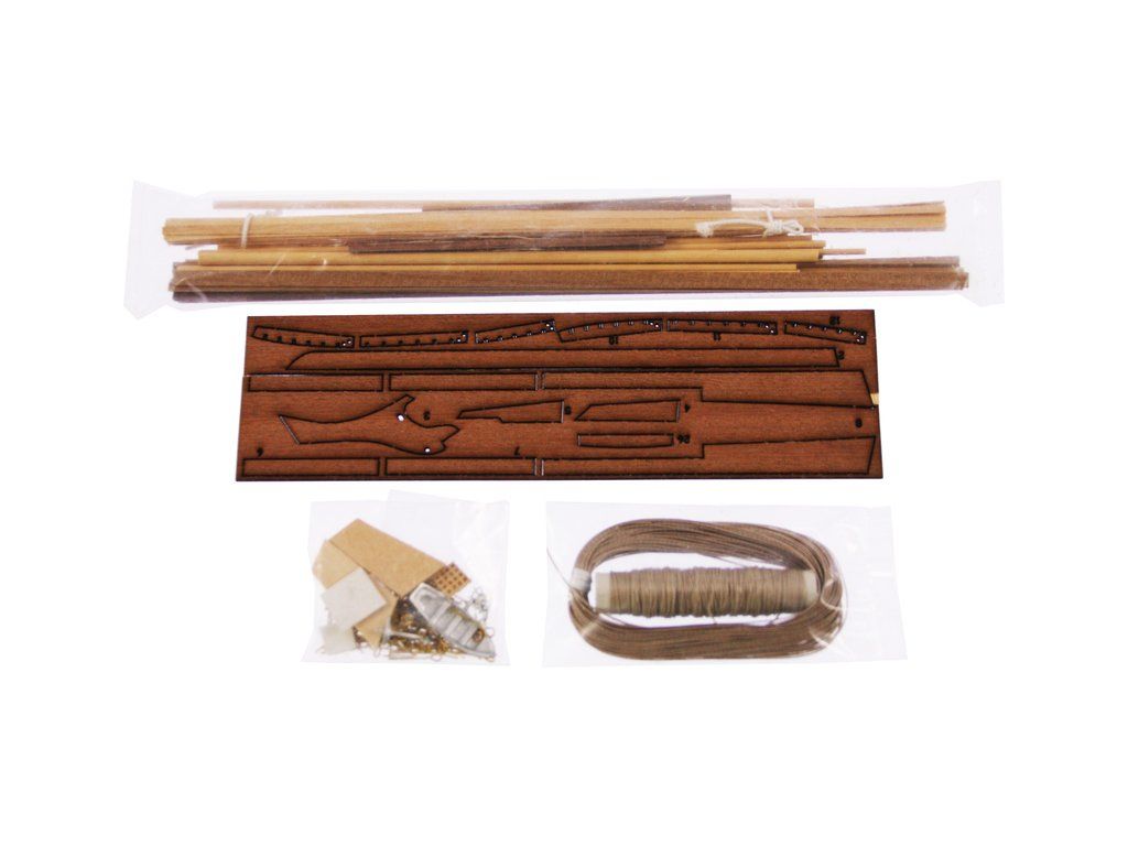 Balení obsahuje sadu překližkových dílů, sadu dřevěných lišt o různém průřezu, blistr s drobnými díly, sadu výkresů a manuál anglický, německý, francouzský a italský.