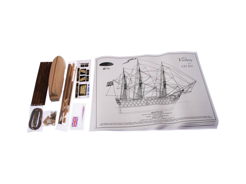 Stavebnice neplovoucího modelu COREL H.M.S. Victory v měřítku 1:310 z roku 1805. Stavebnice slavné HMS Victory, vlajkové lodě Admirála Nelsona v bitvě u Trafalgaru v roce 1805. V balení jsou dřevěné díly, lišty a množství kování, příslušenství, plány atd.