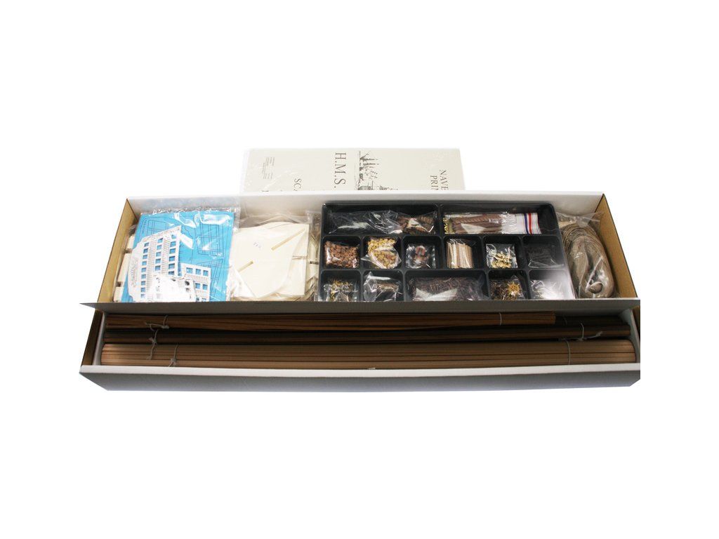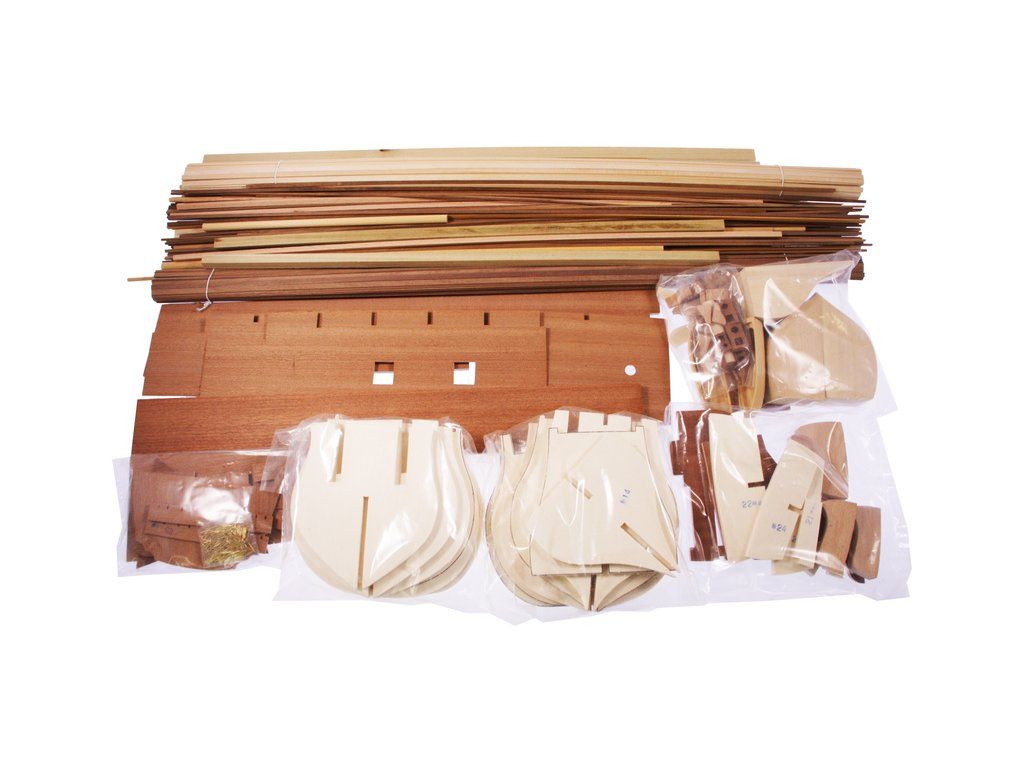 Balení obsahuje sadu překližkových dílů, sadu dřevěných lišt o různém průřezu, sáčky s drobnými díly, díly z mosazi a kovu, sadu výkresů a vícejazyčný manuál.