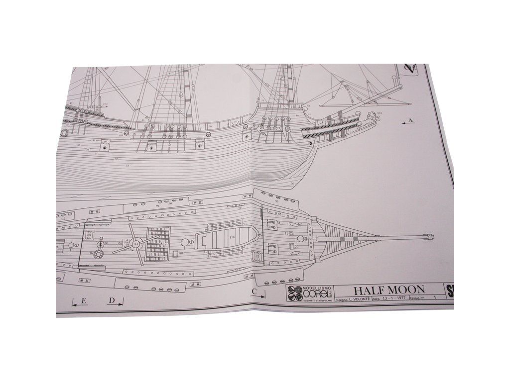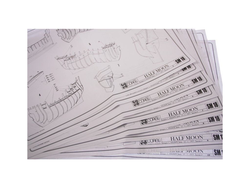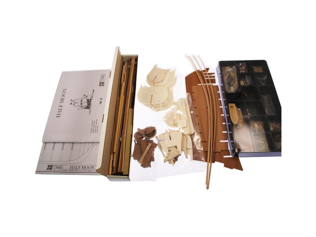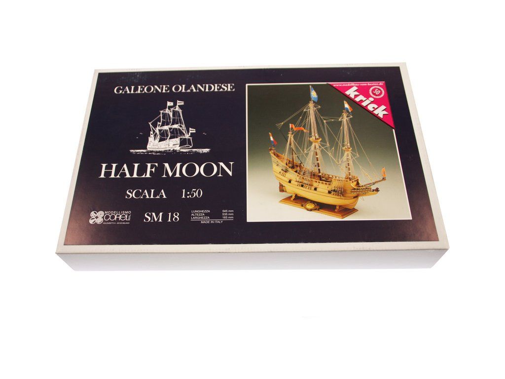 Stavebnice neplovoucího modelu COREL Half Moon v měřítku 1:50 z roku 1609. Tato loď proslavila holandského kapitána Hudsona z Halve Maen, který nalezl velkou zátoku na východním pobřeží Ameriky kde bylo založeno město později New York. V balení jsou dřevěné díly, lišty a množství kování, lanoví, plátno na plachty, plány atd.
