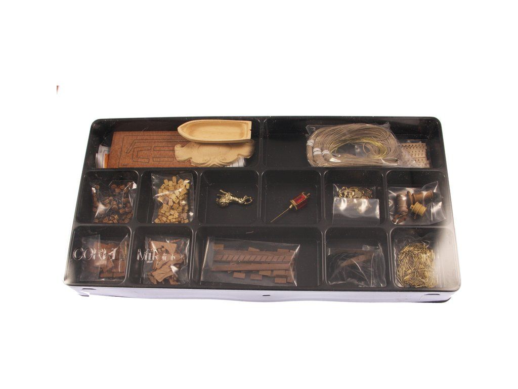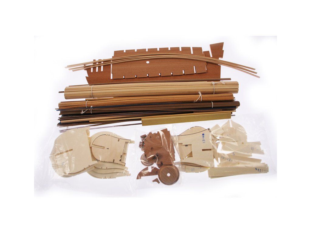 Balení obsahuje sadu překližkových dílů, sadu dřevěných lišt o různém průřezu, blistr s drobnými díly, sadu výkresů a anglický manuál.