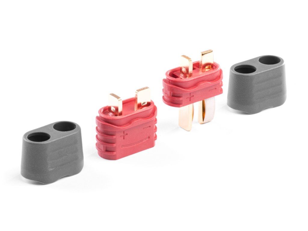 Dvoukolíkový silový konektor s plochými zlacenými kontakty se zatížitelností max. 50 A (dlohodobě 25A) se zaobleným drážkovaným tělem pro pevnější uchopení a kryty kabelů. Pro kabely o průřezu max. 3,3 mm2 (12AWG). Přechodový odpor 0,45 mOhm, max. 500 V. Balení 1 pár s kryty kabelů.Doplňkové parametry