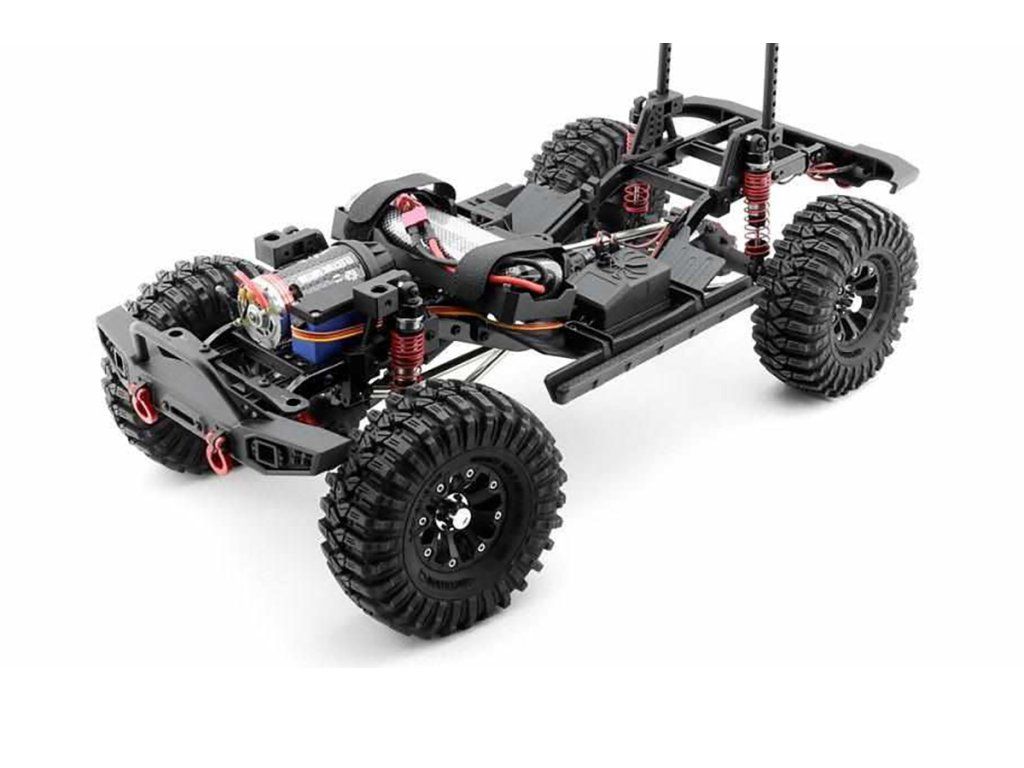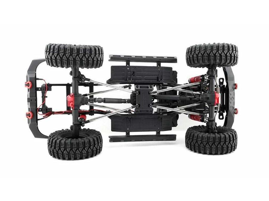 Podvozek má ocelové žebřiny podvozku, uložení baterie vpředu, 45stupňový úhel zatáčení s pozitivním Ackermannem, ocelové pevné osy, kuličková ložiska, odolné kovové převody s třecí spojkou, ocelové CVA hnací hřídele, beadlocková kola a další.