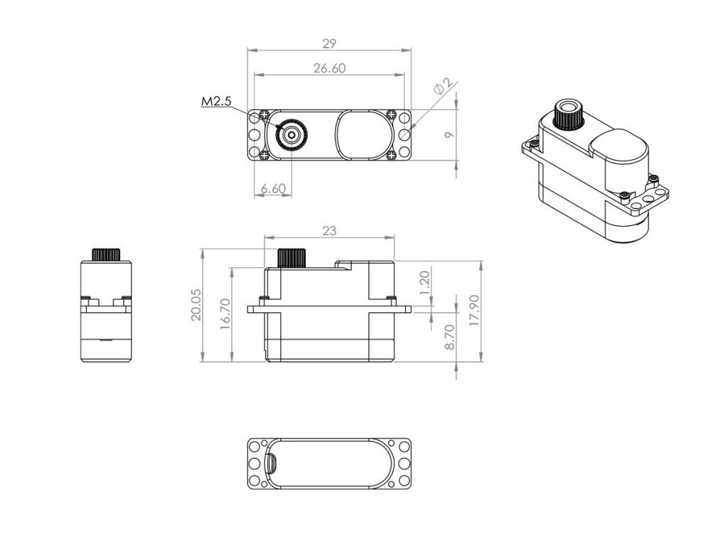 Silné programovatelné tenké digitální mikroservo s titanovými převody uloženými na jednom kuličkovém, jednom samomazném a dvou jehlových ložiscích. Díky přesným předepjatým převodům s minimálními vůlemi a ploché krabičce s výškou 9 mm je zvláště vhodné pro ovládání křidélek a klapek v RC házedlech F3K, malých větroních a motorových modelech s tenkými profily křídla, jako jsou F5D modely pro závody okolo pylonů. Pro dokonalé chlazení i při vysokém zatížení je servo uloženo v hliníkové krabičce s patkami pro montáž na plocho.
