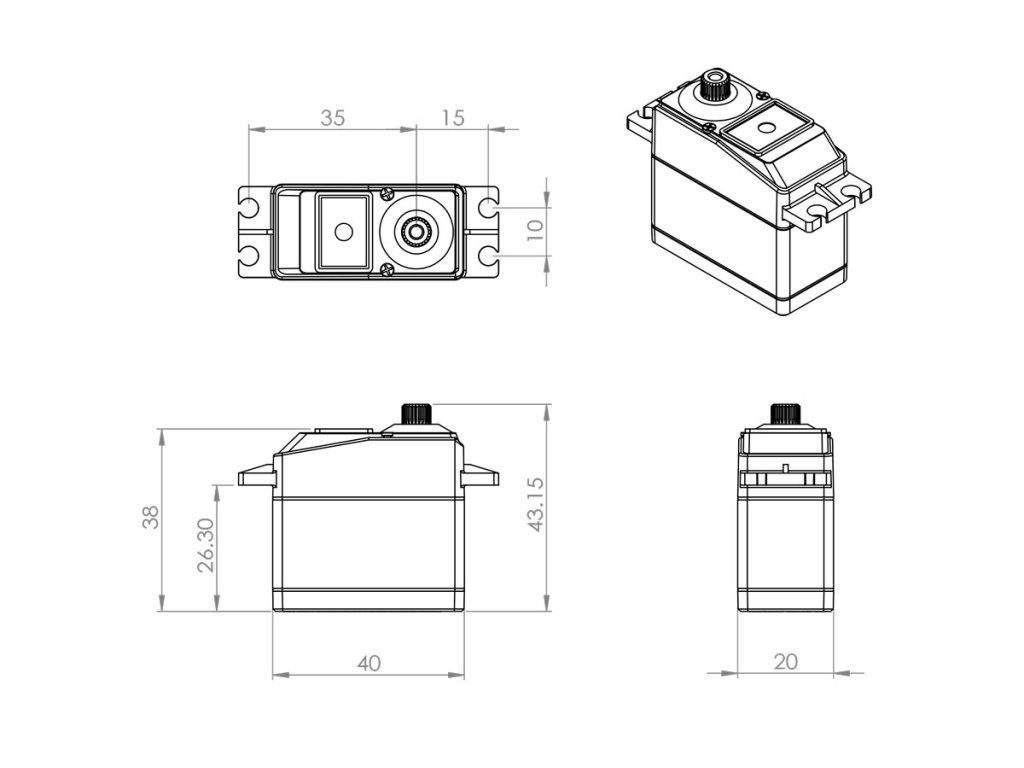 Silné digitální standardní servo s kovovými převody s výstupní hřídelí uloženou na dvou kuličkových ložiscích pro všeobecné použití pro větší modely letadel, ale také aut a lodí. Pro dokonalé chlazení i při vysokém zatížení je servo uloženo ve vodotěsné a prachotěsné krabičce s hliníkovou střední částí. Servo není programovatelné.