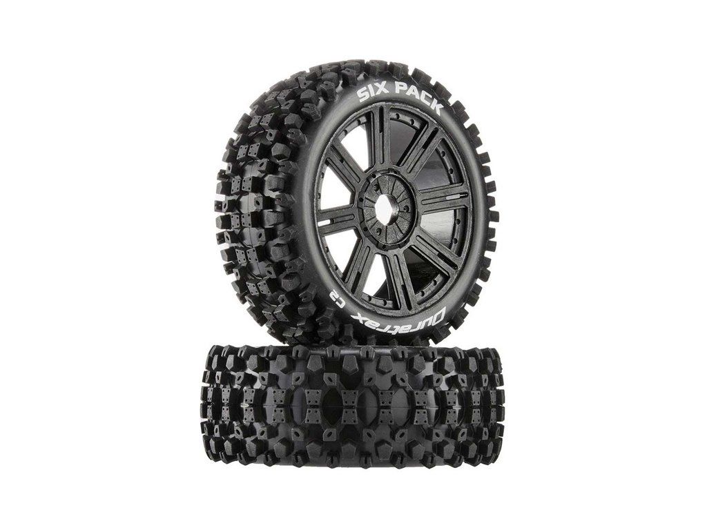 Kompletní kola Duratrax Six Pack Buggy 3.8" pro RC modely aut. Rozměr disku ⌀ 82x42 mm, celkový rozměr ⌀117x43 mm. Unašeč je šestihran 17 mm s offsetem 34 mm. Disk má černou barvu, tvrdost směsi pneumatiky C2 - měkká směs..