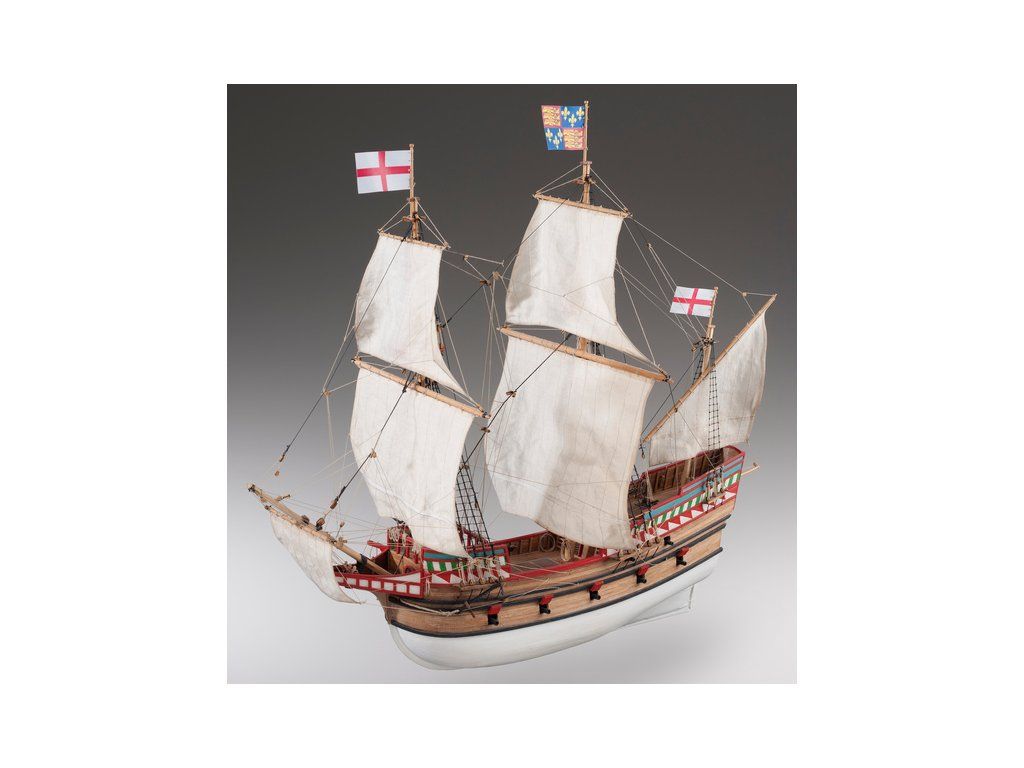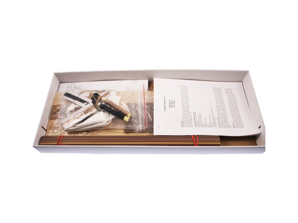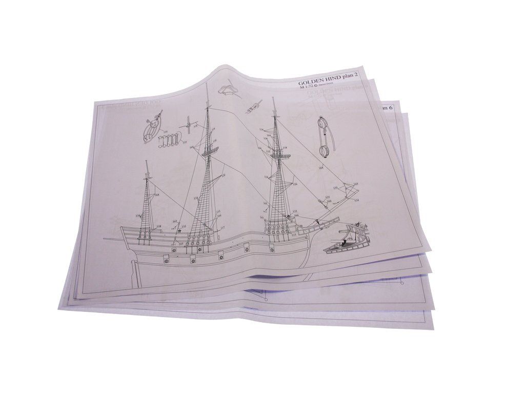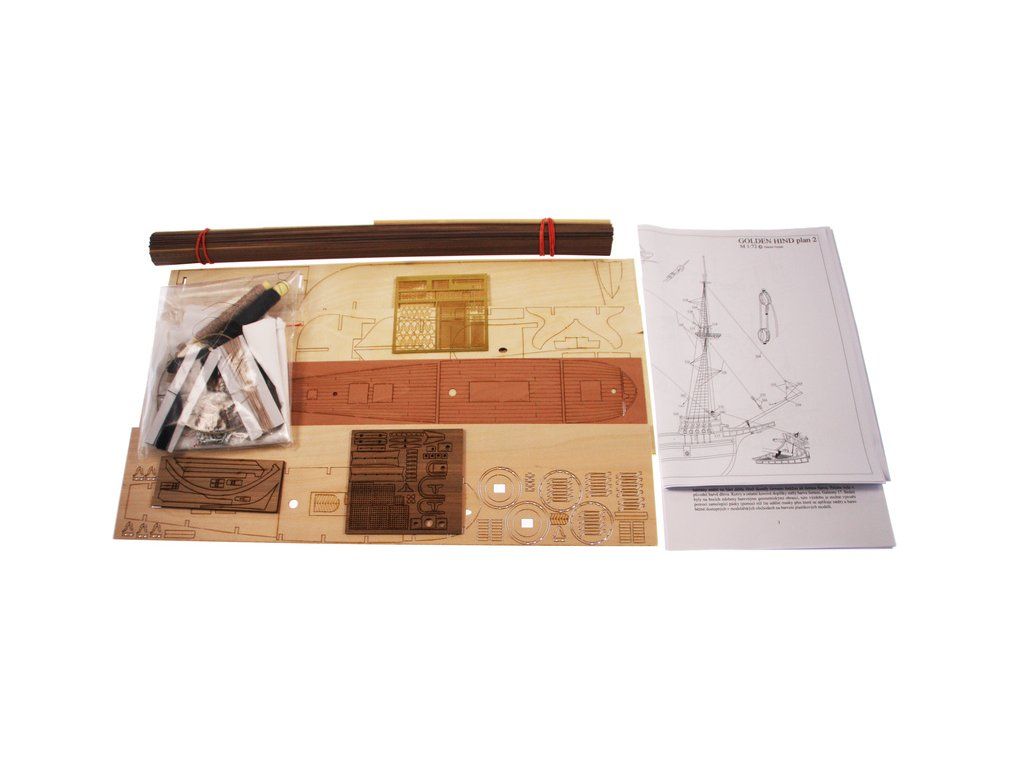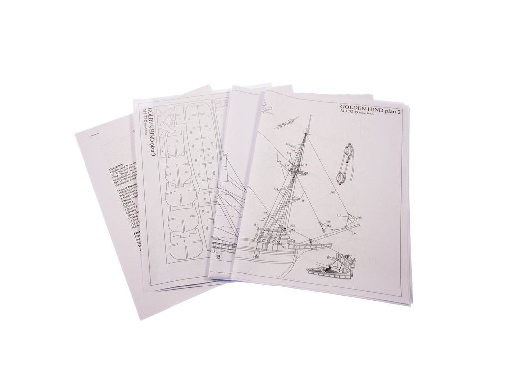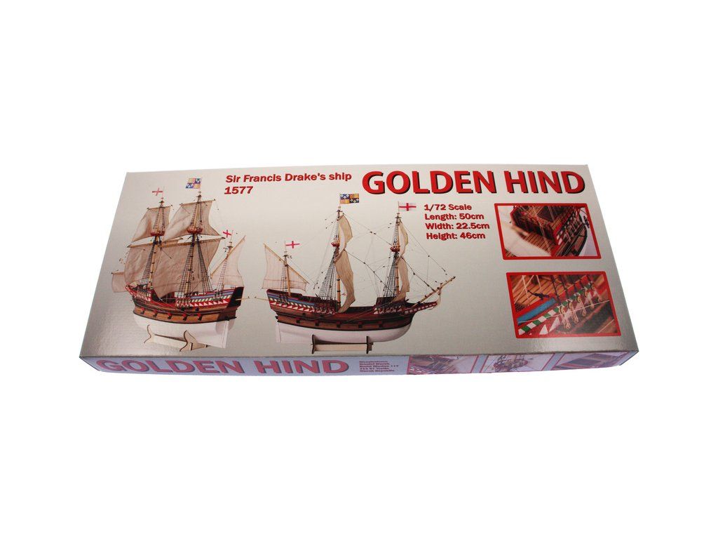 Stavebnice modelu Golden Hind z roku 1577 v měřítku 1:72 Francise Drake. Délka modelu lodi je 500mm, stavba převážně ze dřeva s drobnými doplňky, součástí je stavební plán a pokyny s mnoha podrobnými obrázky.