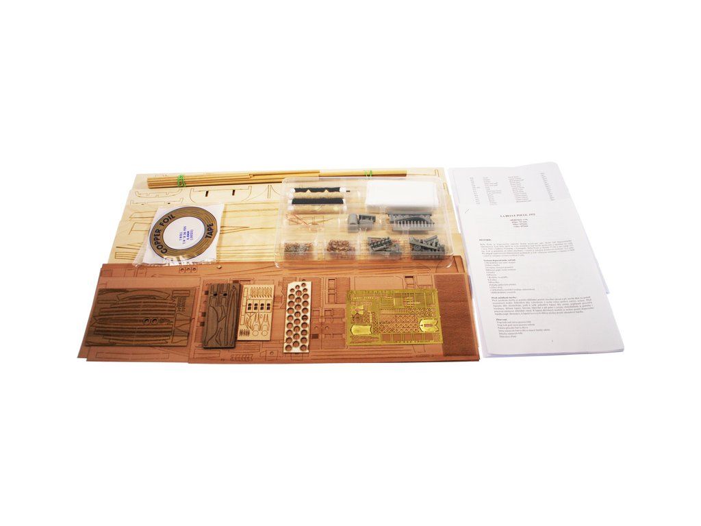 V balení stavebnice makety je sestava laserem vyřezaných desek z překližky a kompletní dřevěné součásti, mosazné součásti, prkna a lišty pro palubu, předtištěné vlajky, látku pro plachtu a dostatek lanoví na celou loď. Sestavení pomáhá podrobný plán stavby a přesné pokyny, manuál EN, FR, CZ.