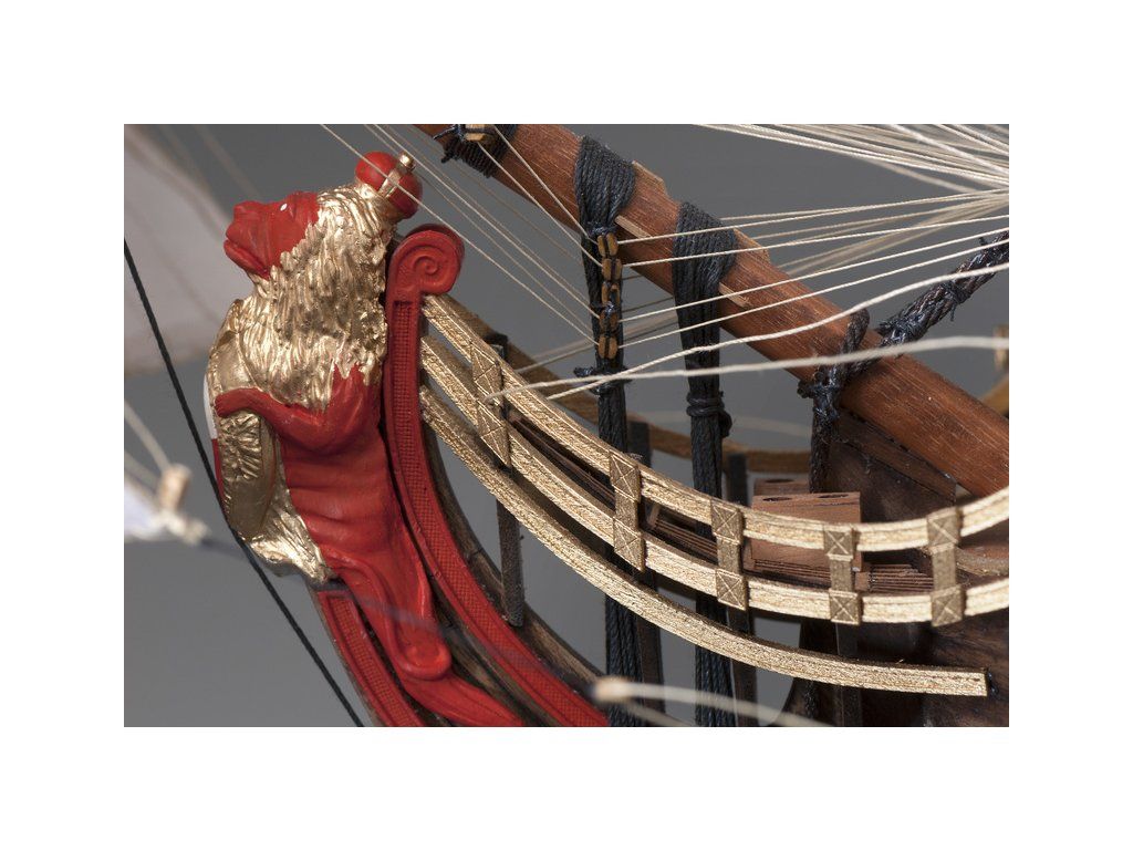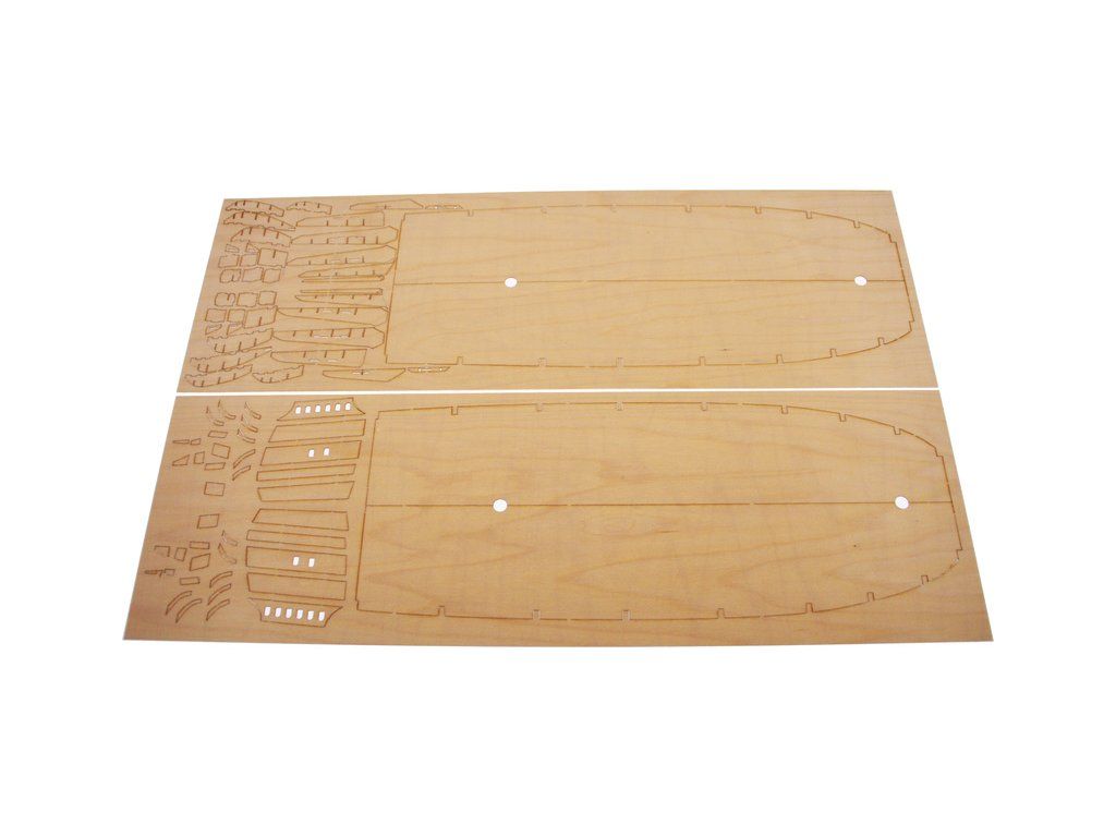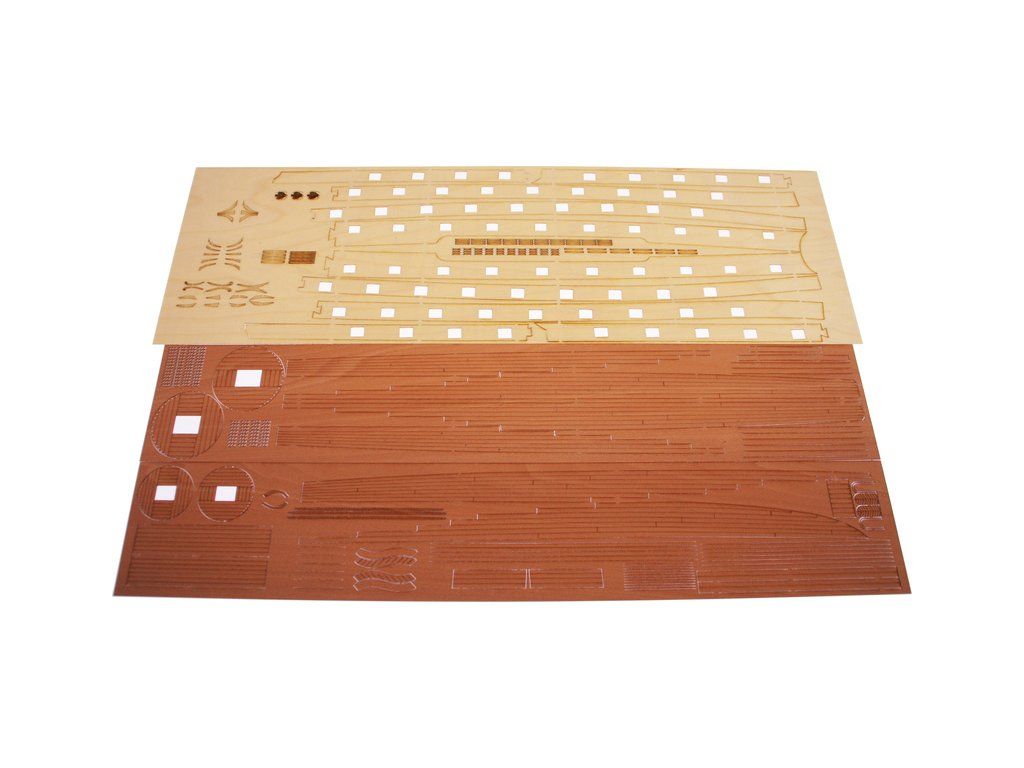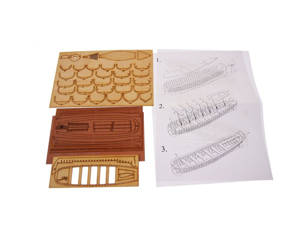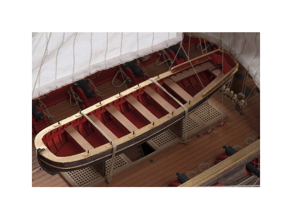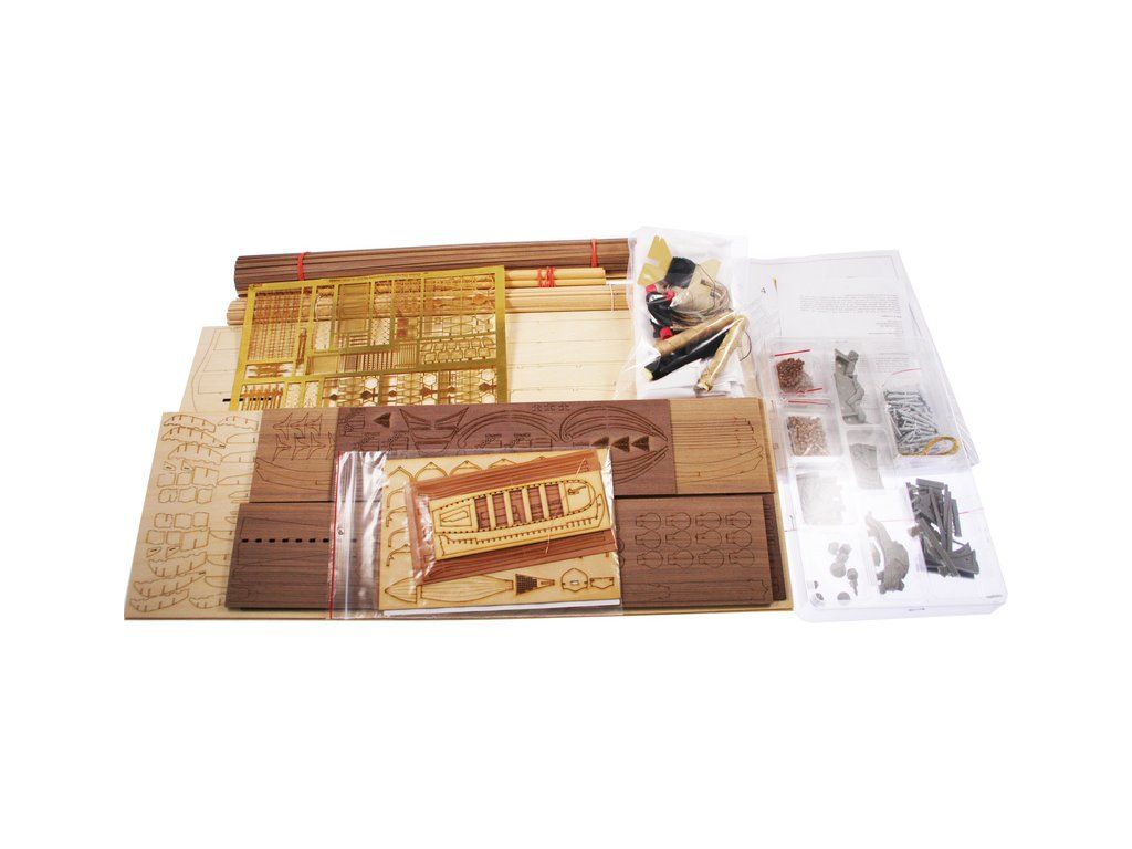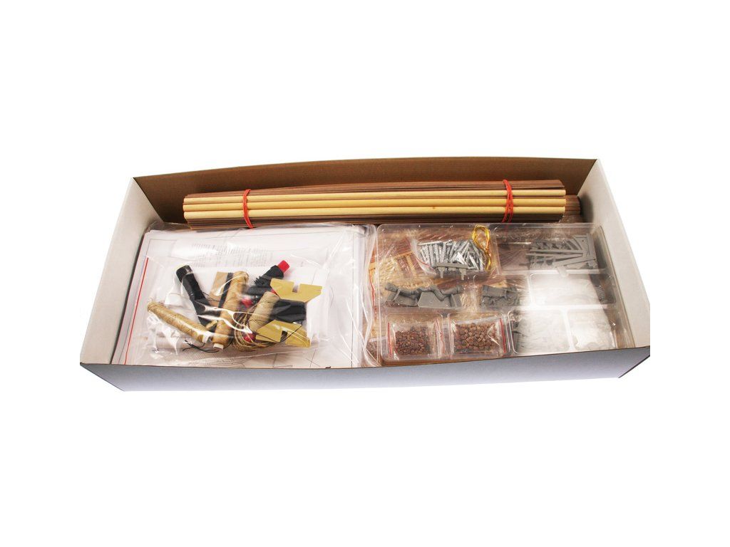 V balení stavebnice makety je sada laserem vyřezaných desek z překližky, svazky ličt a nosníků různých rozměrů a kompletní dřevěné součásti, mosazné součásti, prkna a lišty pro palubu, předtištěné vlajky, látka pro plachtu a lanoví na celou loď. Manuál EN.