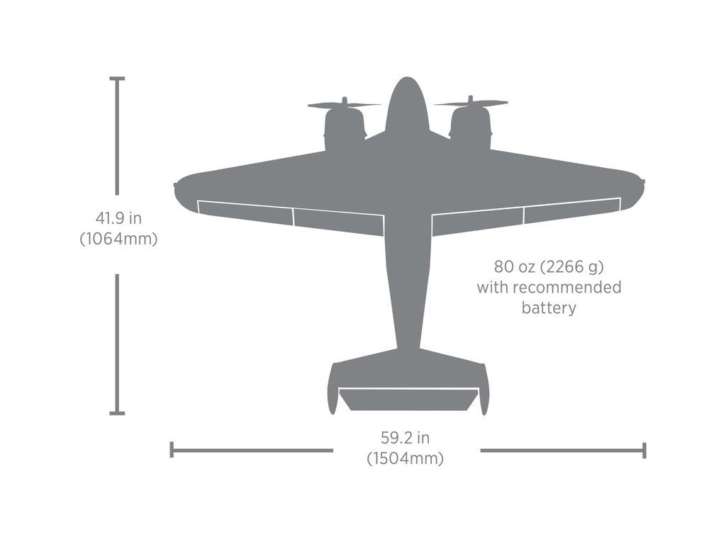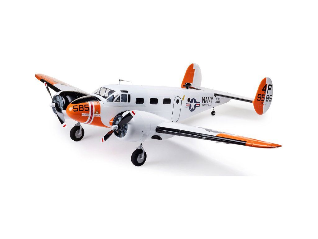 Detailní polomaketa dvoumotorového RC modelu letadla od E‑flite, Beechcraft D18 o rozpětí 1.5 metru. Výborné letové vlastnosti a snadné ovládání. Nainstalované LED osvětlení, vztlakové klapky, elektrický podvozek. Verze PNP bez přijímače a vysílače.