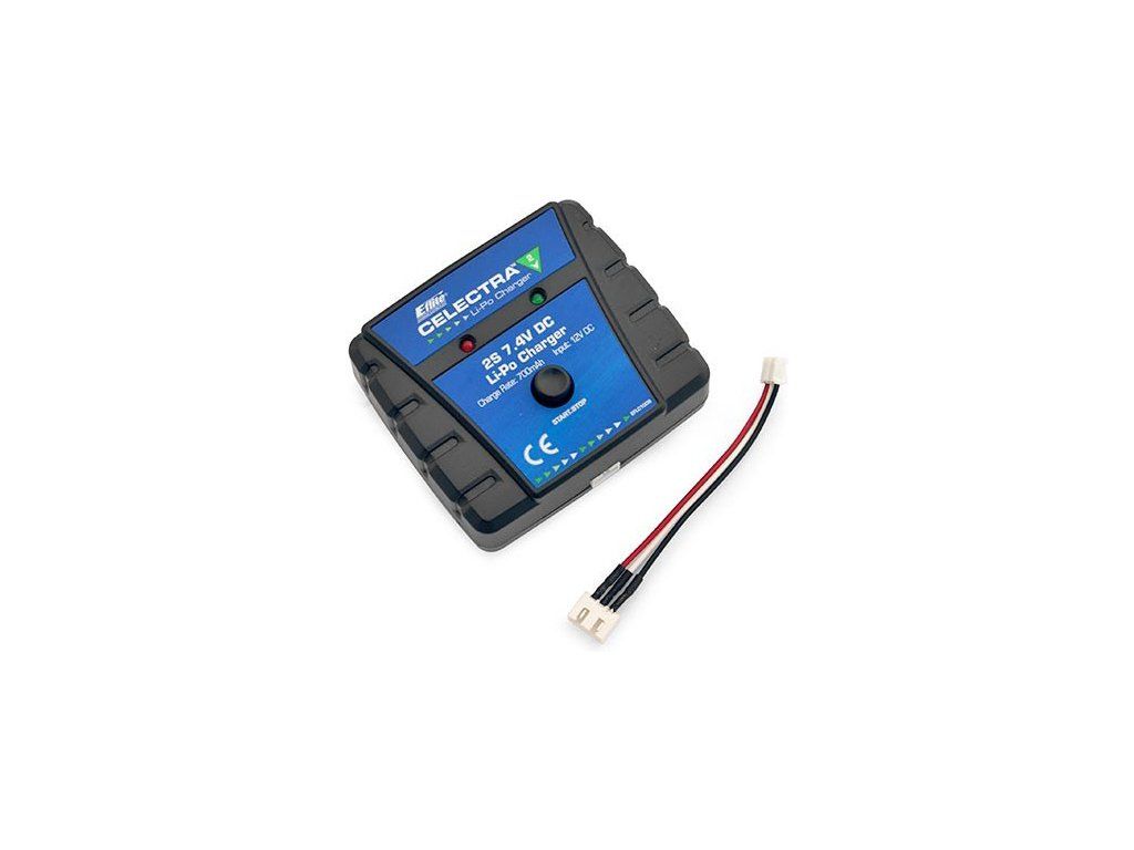 Jednoduchý E-flite nabíječ LiPol baterie 2-články 7.4V, DC 12V, proud 700mA. Pro nabíjení je nutno nabíječ připojit ke vhodnému zdroji 12V. V balení je redukce konektorů PH - PH 1.5 (Ultra Micro).
