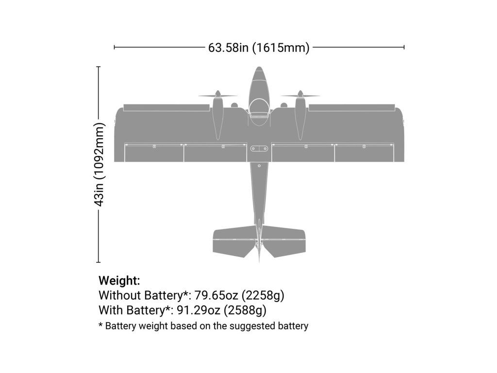 - Pro delší lety LiPo akumulátor Spektrum Smart 11.1V 3200mAh 30C IC3 s technologií Smart, nebo LiPo akumulátor Spektrum Smart G2 11.1V 3200mAh 30C IC3 s technologií Smart G2