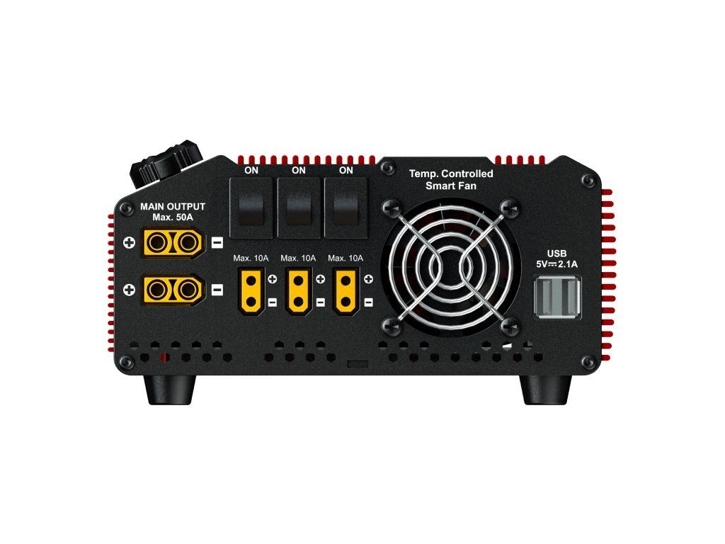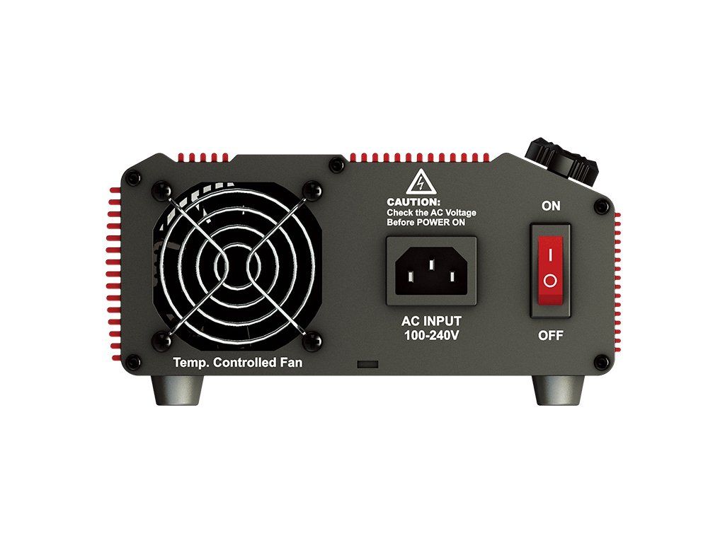 Hlavní výstup zdroje 15-30 V/50 A (max. 1200 W) je opatřen robustními šroubovacími zdířkami pro standardní 4 mm banánky. Navíc jsou k dispozici 3 paralelní zásuvky pro 4 mm banánky opatřené vypínači. Napětí výstupu je nastavitelné pomocí knoflíku na předním panelu, napětí a proud na výstupu jsou zobrazovány na LCD displeji.