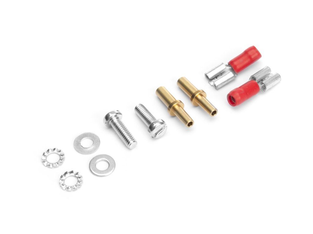 Včetně: kovové upevnění pomocí šroubů a příslušenství s elektrickými zástrčkami a dvěma mosaznými redukčními přípojkami.