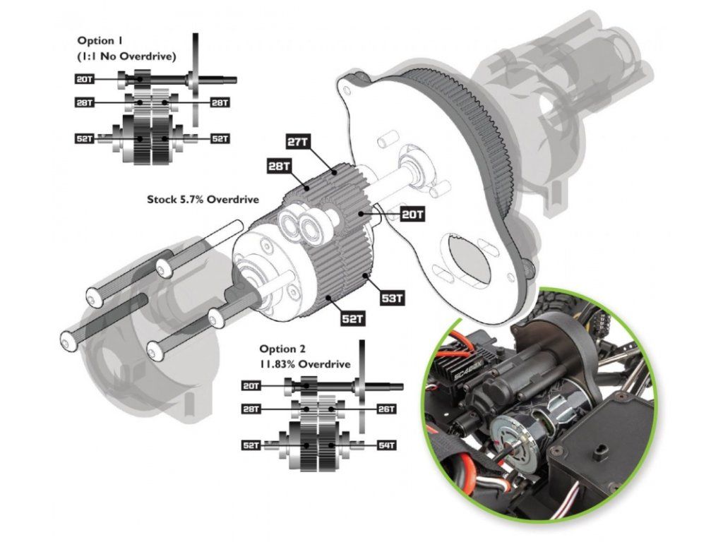 Srdcem modelu Enduro je naše revoluční převodovka Stealth (R) X. Ačkoli zvenku vypadá jako běžná třístupňová převodovka, uvnitř zdaleka běžná není. Převodovka Stealth (R) X se vyznačuje možností nastavit převodový poměr zadního pohonu nezávisle na předním pohonu ve třech úrovních: sériová převodovka přeřazuje předek o 5,7 % (instaluje se do RTR), volitelná varianta 1 poskytuje převodový poměr předek-zadek jedna ku jedné (k dispozici samostatně) a volitelná varianta 2 přeřazuje předek o 11,83 % (součástí RTR).