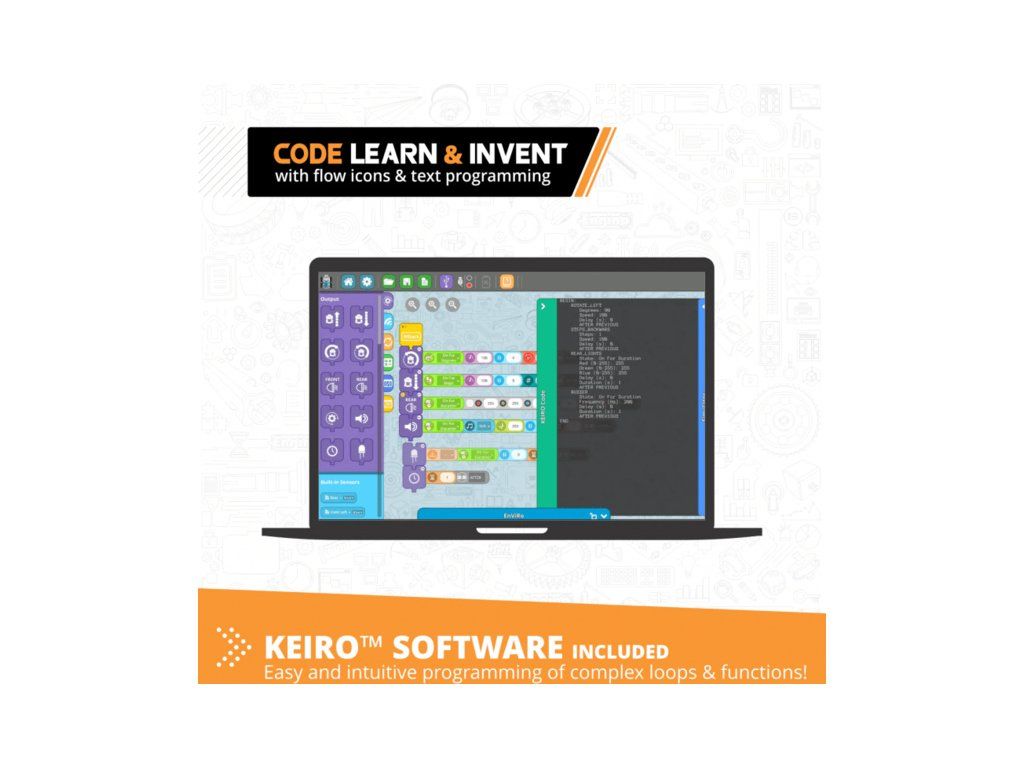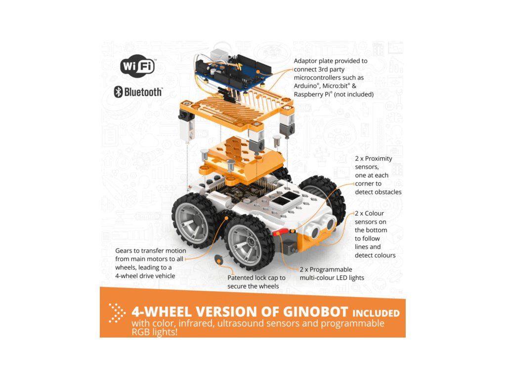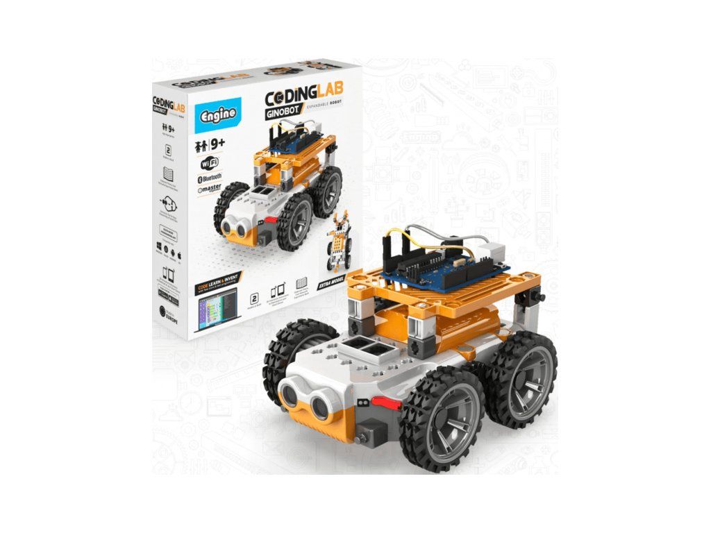 Engino Coding Lab GINOBOT je inovativní robotické vozidlo s wi-fi a BT konektivitou, ideální pro studenty základních a středních škol, ale také pro amatérské nadšence. Děti si mohou sestavit dva mechanismy, které následně naučí jezdit a pohybovat se pomocí programování. Obsahují senzory a LED.