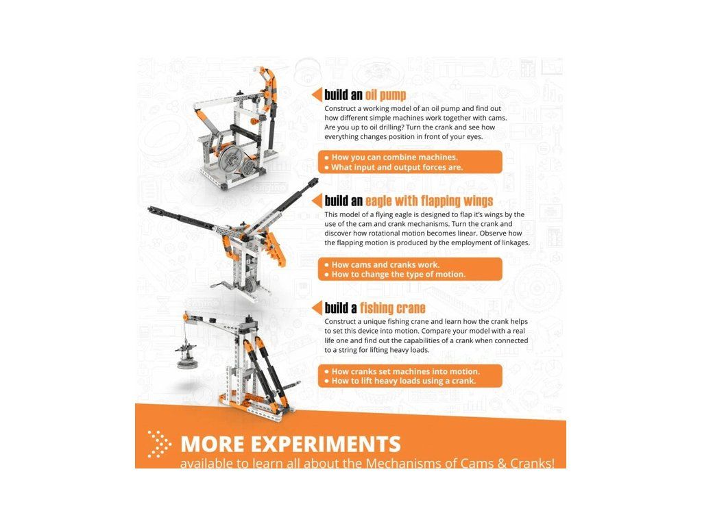 Zábavné a praktické výukové stavebnice Engino Stem Mechanics vačky a kliky, umožní lépe pochopit základní principy fyzikálních procesů. Dítě si může osahat a vlastnoručně postavit model, který mu ukáže, jak vlastně funguje. Pro předškoláky i školáky.