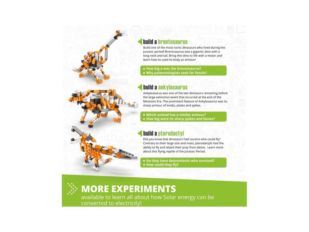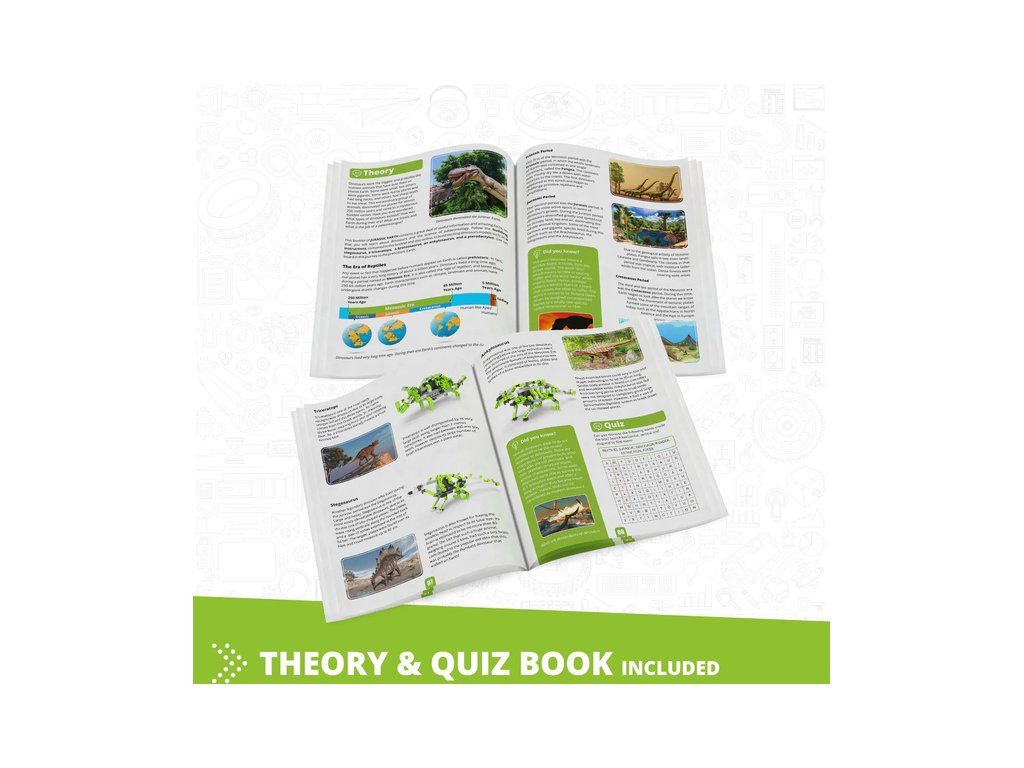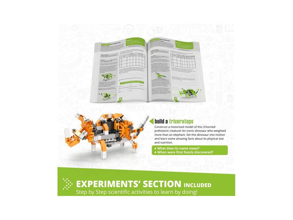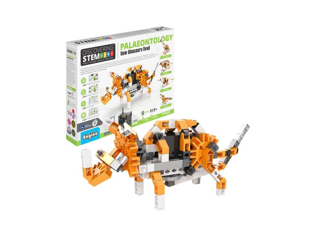 Zábavné a praktické výukové stavebnice Engino Stem Palaentologie, jak žili dinosauři. Dozvíte se o dinosaurech a o tom, jak žili v prehistorické éře na Zemi. Pro předškoláky i školáky. Postav si 5 mechanických modelů poháněných elektropohonem.