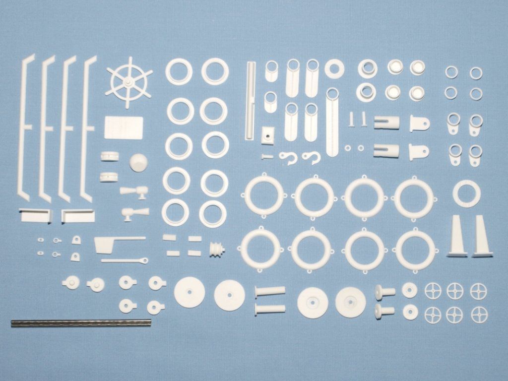 ( záchranné kruhy, zábradlí, světlomety, svítilny, radar, klakson, žebříky, kabinová okna, kladky, kování stěžňů a ráhen, boční jeřáby, díly k navijákům atd. ). Díly podstavce, palubu, jednotlivé části kabiny jsou z překližky, která je gravírovaná a již vyříznutá laserem. Stěžně a ráhna jsou z bukové kulatiny. Výztuhy bortů jsou z borových nosníků.