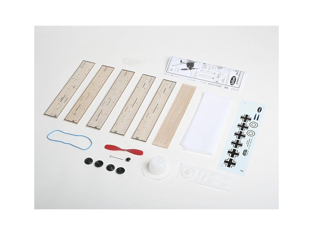 Stavebnice obsahuje: balsové předseknuté díly, balsové nosníky, vakuově lisované díly (kryt motoru, kryt kabiny...), plastovou vrtuli s hřídelí a hlavicí, gumový svazek, kola, ocelovou strunu na podvozek a další drobné díly, potahový papír, aršík mokrých obtisků, stavební plán.