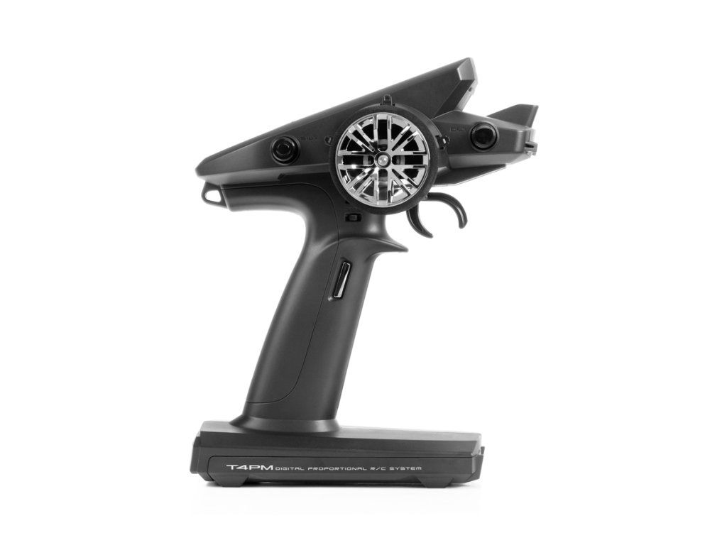 Vysílač T4PM plus v klasickém volantovém designu s rukojetí dokonale padnoucí do ruky je vybaven volantovým ovladačem řízení, spouští pro ovládání plynu, dvěma tlačítkovými přepínači, jedním otočným ovladačem a pěti digitálními trimy (3 okolo volantu, 2 na rukojeti). K programování slouží trojice tlačítek a multifunkční joystick; snadnou orientaci v intuitivním menu zajišťuje velký podsvícený LCD displej. T4PM má paměť pro 40 modelů a širokou škálu pokročilých programových funkcí pro běžné i speciální modely aut - např. nezávislé řízení a pohon (se 2 regulátory) předních i zadních kol pro crawlery, dvojokruhové brzdy pro velké modely 1:5, gyro pro drifting, ABS, kontrola trakce, mix pro tanky apod.