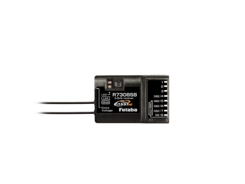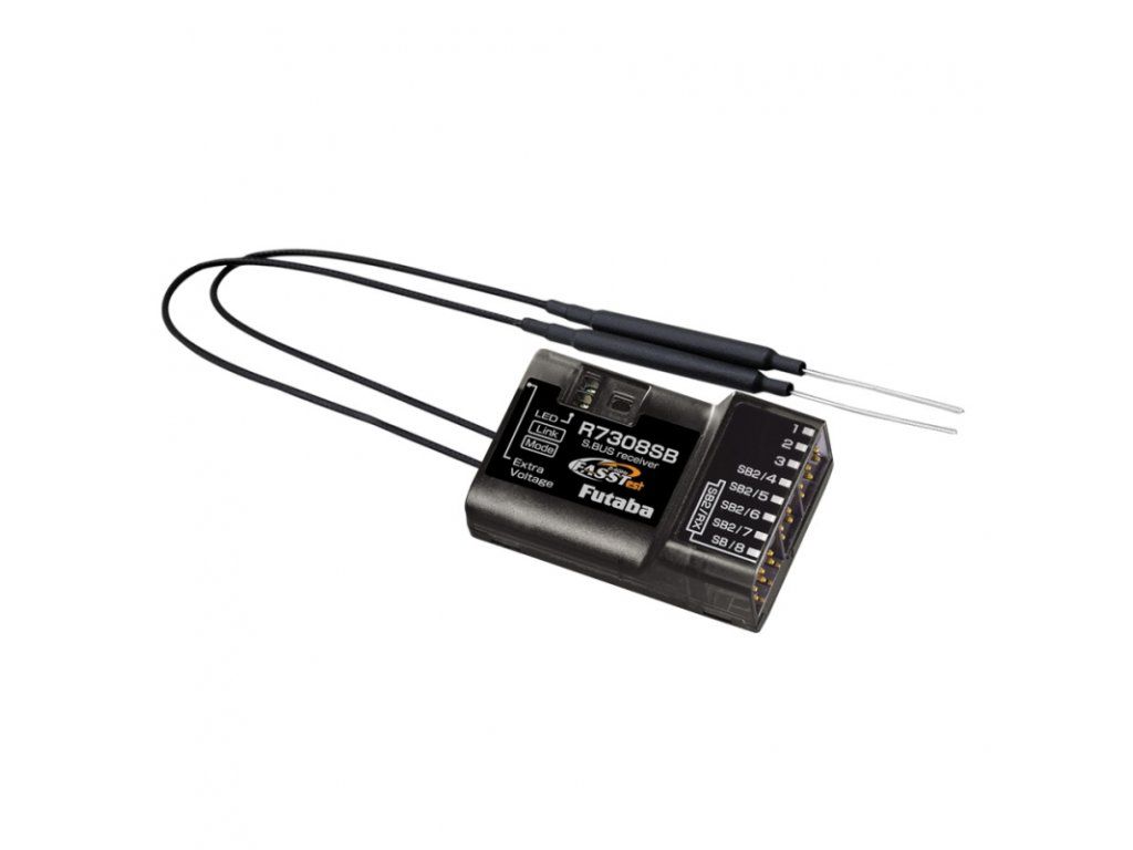 Osmikanálový telemetrický přijímač Futaba přenosového systému FASSTest-2.4GHz s dvojicí diverzitních antén s plným dosahem. Je určen pro všeobecné použití v modelech všech kategorií; díky kompaktním rozměrům, nízké hmotnosti a konektorům zasouvaným v podélné ose je vhodný i pro modely se štíhlým trupem, jako jsou větroně F3B, F3J apod. Díky volitelným kanálovým režimům a možnosti dvoupřijímačového provozu výborně poslouží i v modelech vyžadujících velký počet kanálů – v takovém případě dvojice R7308SB poskytne až 16 klasických PWM kanálových výstupů nebo 14-15 PWM výstupů a 1-2 S.BUS sériové výstupy. Kromě toho je přijímač vybaven portem S.BUS2 pro obousměrnou komunikaci umožňující připojení S.BUS2 serva, telemetrických čidel a dalších kompatibilních zařízení, jako S.BUS2 porty mohou sloužit také zásuvky kanálů 4-7. Provozní stavy přijímače jsou signalizovány LED indikátorem.