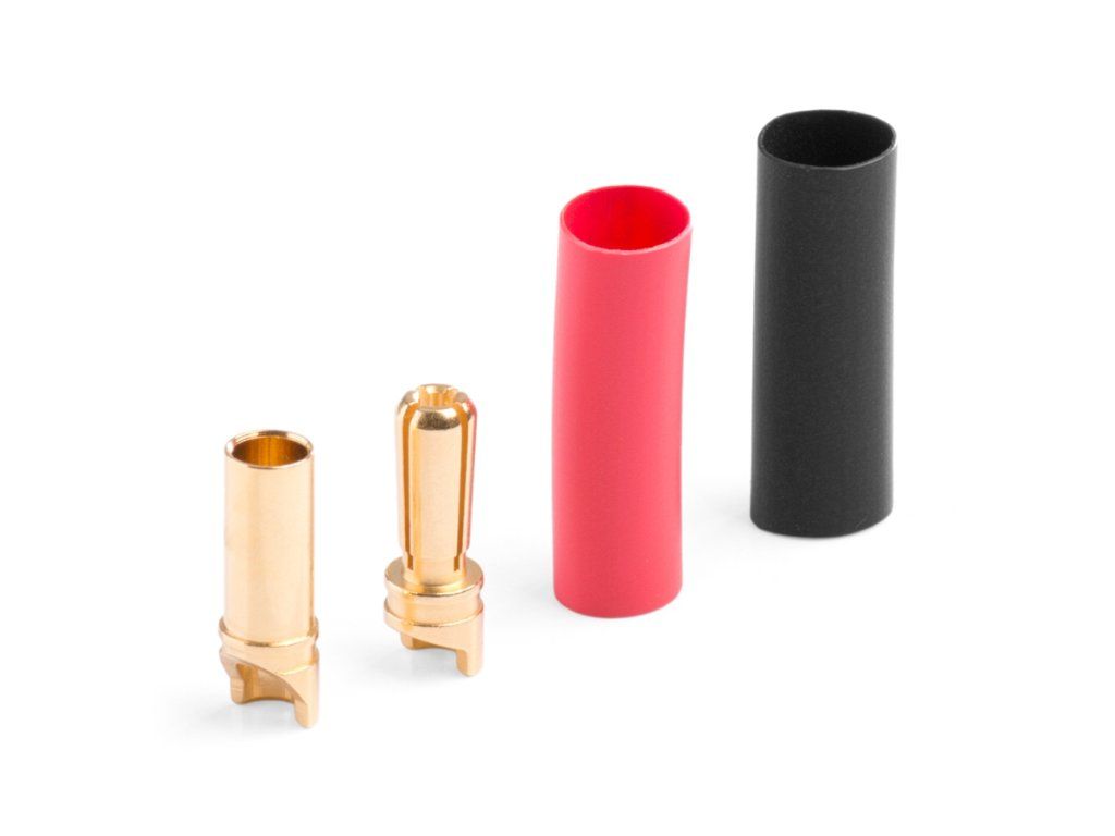 Silový zlacený konektor 3,5 mm se segmentovým pružným kolíčkem se zatížitelností max. 50A (dlouhodobě 25A). Pro kabely o průřezu max. 2,1 mm2 (14AWG). Přechodový odpor 0,45 mOhm, max. 500 V. Balení 10 párů kolíček/dutinka se smršťovací bužírkou.Doplňkové parametry