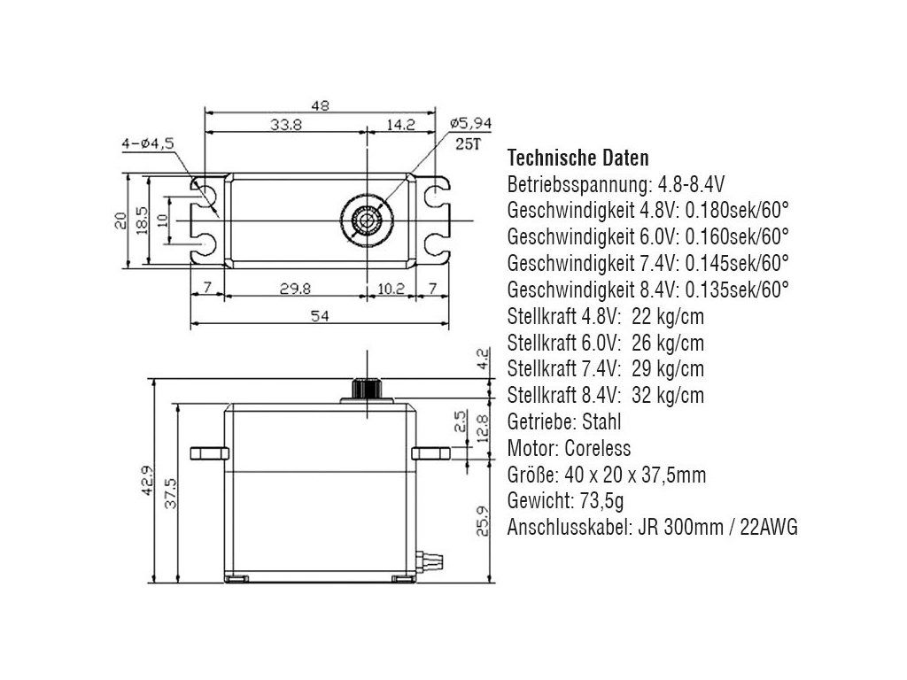 | Moment: | 22kg.cm @ 4,8V; 26kg.cm @ 6,0V; 29kg.cm @ 7,4V; 32kg.cm @ 8,4V; |