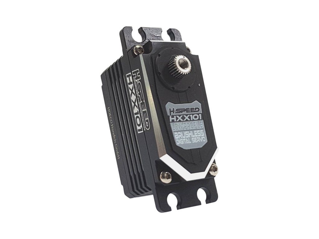 Kvalitní digitální nízkoprofilové servo H-Speed HXX101 pro RC modely aut 1:10, moment 13-18kg.cm @ 6-8.4V, rychlost 0,049-0,070s/60°. Kovové převody, střídavý motor, proudová a tepelná ochrana, hmotnost 51g, rozměry: 42x21x27mm. Tisícihran 25T.