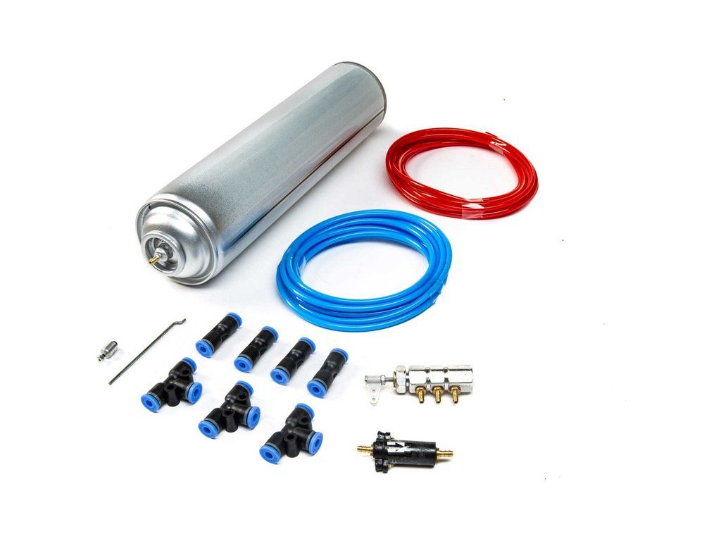 Náhradní díl pro RC model letadla Nakajima Ki-43 Oscar: Přislušenství pneumatického podvozku obsahuje tlakovou nádobu, hadičky, přepouštěcí ventil, rozbočovače a průchodky.