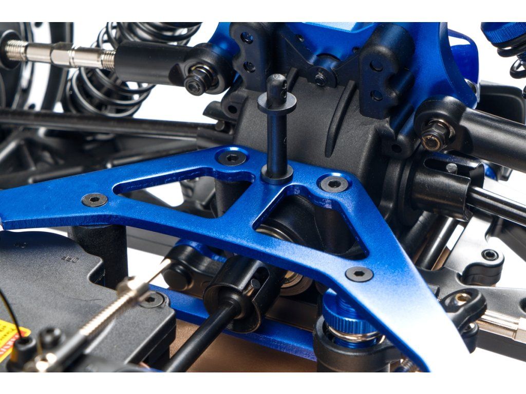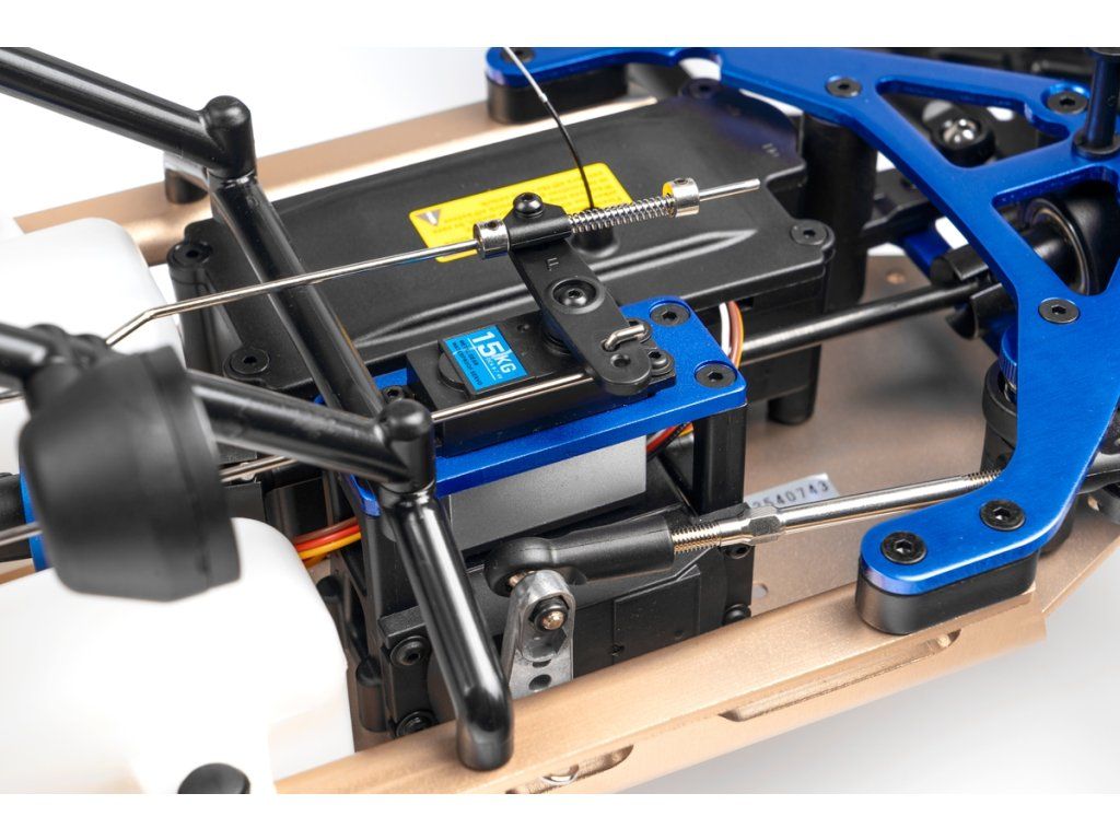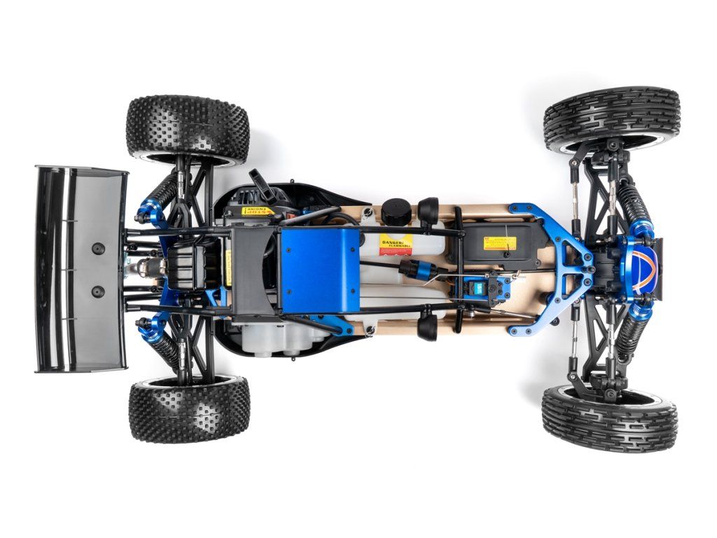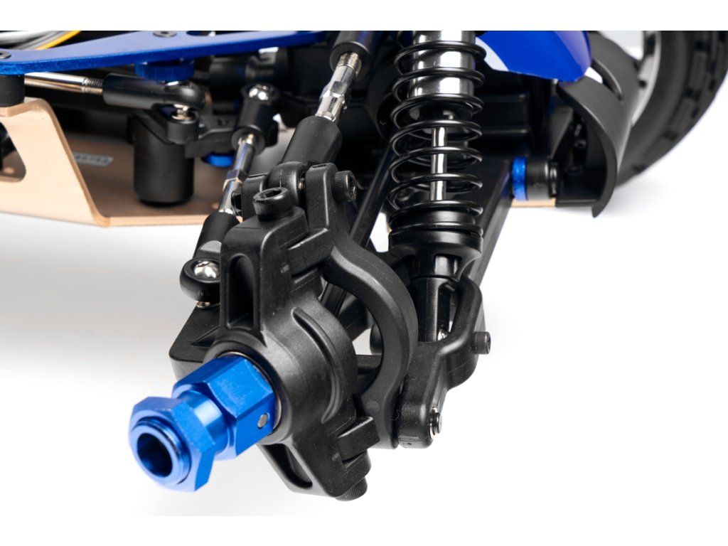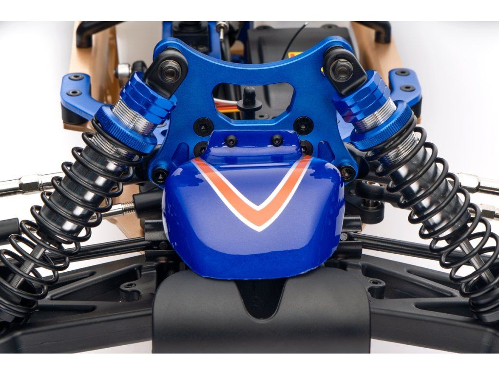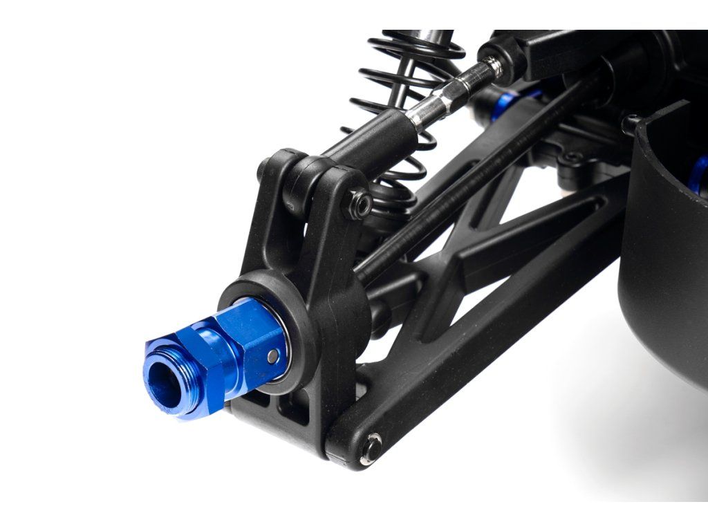 Veškeré spojovací tyče (svorníky ramen apod.) jsou ocelové o průměru 7mm vybavené pravo-levým závitem a šestihranem, což umožňuje pohodlné a přesné nastavení geometrie podvozku. O odpružení se stará čtveřice celokovových olejových tlumičů s vinutými pružinami. Předpětí pružiny je jednoduše nastavitelné pomocí matice s jemným závitem. Modře eloxované držáky tlumičů (parohy) jsou vyrobeny z 8mm silného!!! duralu. Ráfky kol jsou vybaveny šroubovaným límcem, který zajišťuje pneumatiku bez nutnosti lepení. Nízkoprofilové pneumatiky mají osvědčený "buggynový" vzorek a mají průměr 178mm. Bezpečně zastavit tento model to už chce sílu a proto je použita dvojitá kotoučová brzda.