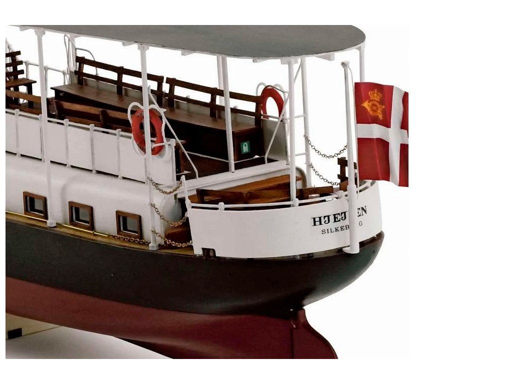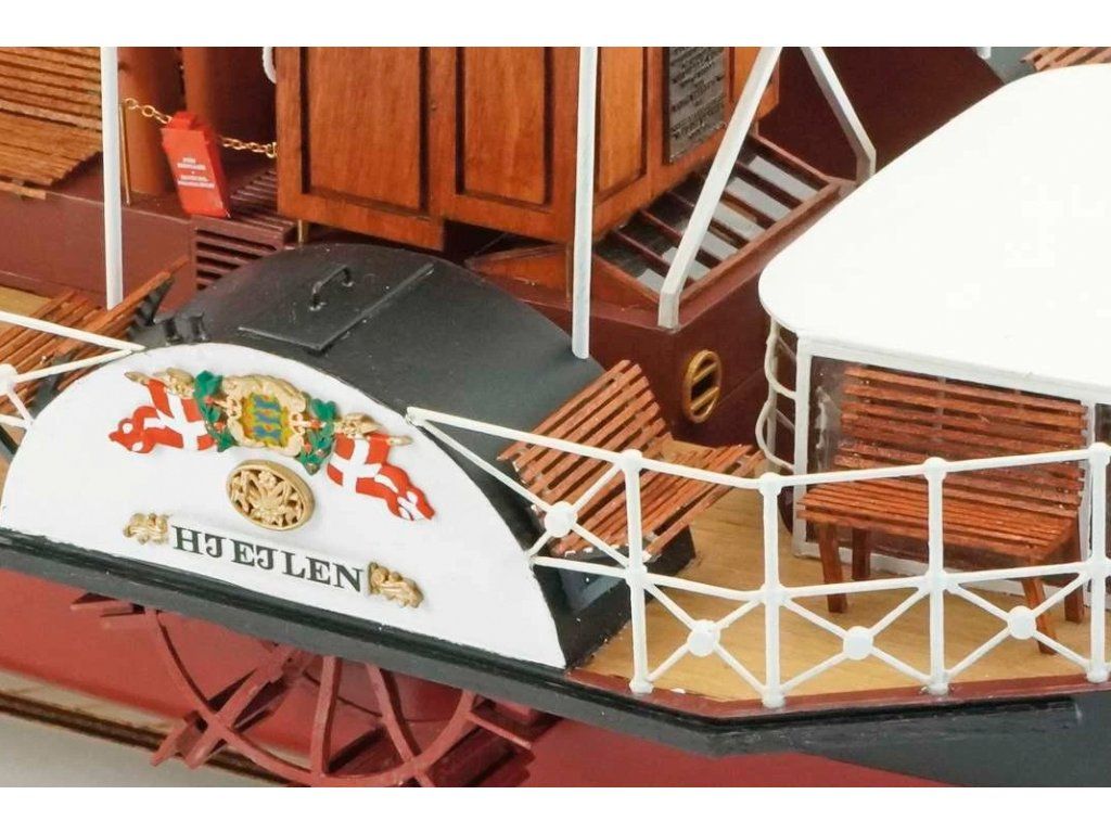 První plavba kolesového parníku Hjejlen z dánského Himmelbjergetu do Silkeborgu dne 24. června 1861 byla vpravdě slavnostní. Na palubě totiž nechybělo Jeho Veličenstvo Frederik VII., král dánský. Loděnice Baumgarten & Burmeister si na ní dala opravdu záležet - Hjejlen totiž přepravuje cestující dodnes a pohání ji stále původní parní stroj! Zatímco pohon zůstával, vnějšek lodi prošel několika proměnami - původně nesla vysoký stěžeň, který ale musel být později odstraněn, aby Hjejlen mohla proplouvat pod nově postaveným železničním mostem na trati do Silkeborgu. Ze stejného důvodu byl nainstalován sklopný komín; později byla přestavěna i kormidelna a místo plátěné střechy se objevila pevná. Stavebnice tak zachycuje loď v podobě, jakou můžete vidět dnes - takovou Hjejlen, na které se můžete svézt i vy.