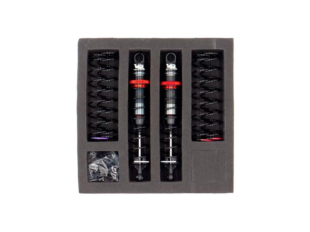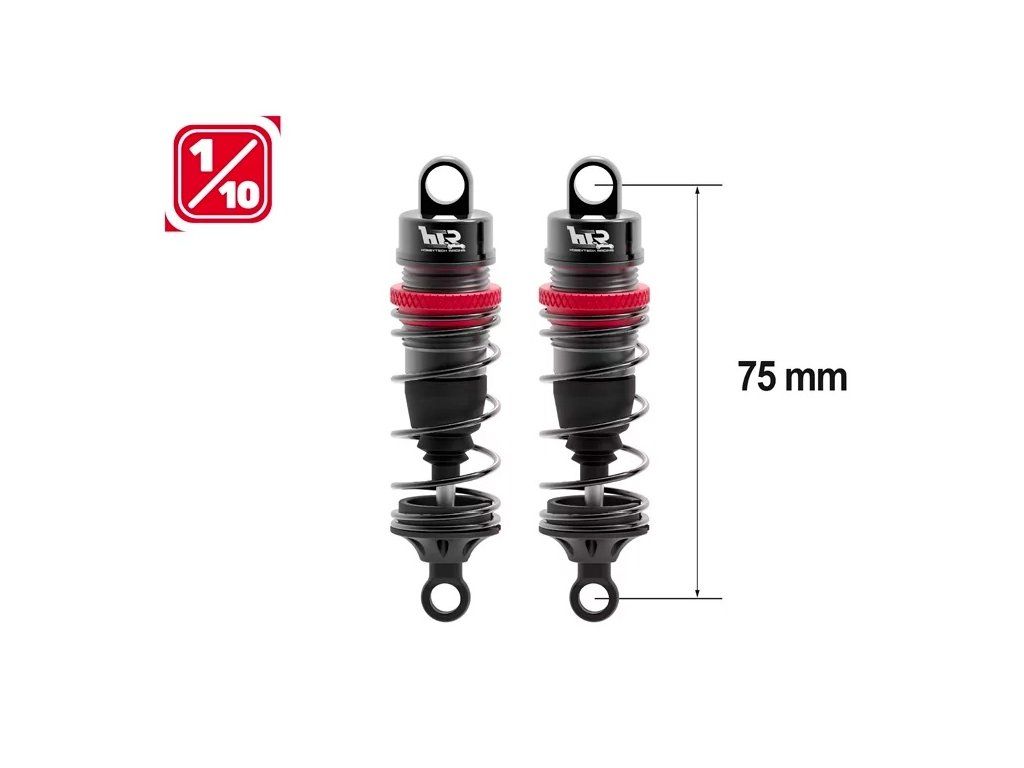 Celohliníkové olejové tlumiče pro modely 1/10 a podobné, Celková délka mezi čepy je 75mm, průměr pístku je 13mm. Sada obsahuje: tři páry pružin: měkké, střední a tvrdé; horní i spodní upevňovací materiál.Doplňkové parametry