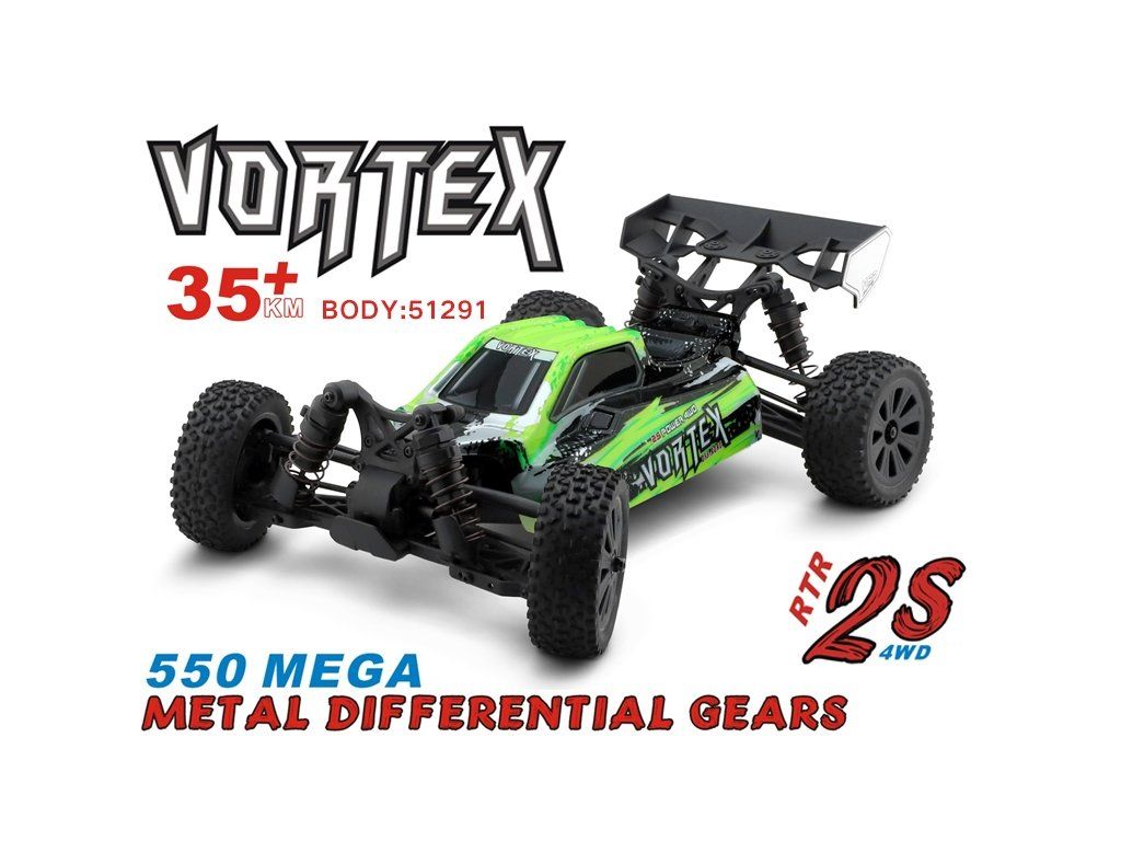Se svým robustním podvozkem je Vortex postaven tak, aby vydržel ty nejtěžší výzvy. Model je poháněn silným stejnosměrným motorem RC550 a voděodolným 60A regulátorem, které mu poskytují bleskové zrychlení a vysokou maximální rychlost.