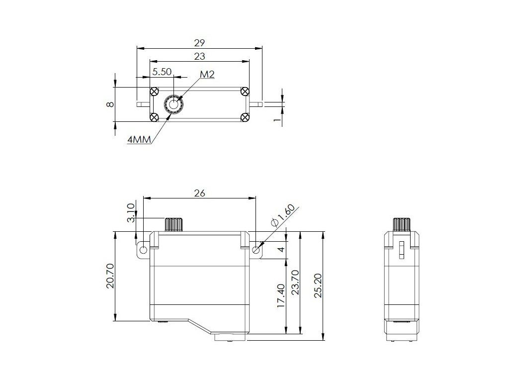 Super silné a rychlé programovatelné tenké digitální mikroservo s titanovými převody s výstupní hřídelí uloženou na dvou kuličkových ložiscích. Díky přesným předepjatým převodům s minimálními vůlemi a ploché krabičce s výškou 8 mm je zvláště vhodné pro ovládání křidélek a klapek v RC házedlech F3K, lehkých větroních (F5J apod.) a motorových modelech s tenkými profily křídla. Pro dokonalé chlazení i při vysokém zatížení je servo uloženo v hliníkové krabičce s patkami pro montáž na plocho.
