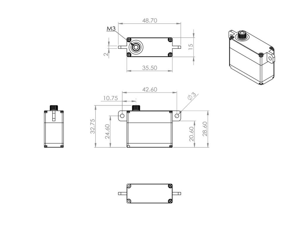 Super silné a rychlé programovatelné digitální mini servo s titanovými převody a výstupní hřídelí uloženou na dvou kuličkových ložiscích. Díky přesným předepjatým převodům s minimálními vůlemi a speciálnímu potenciometru s vysokým rozlišením je zvláště vhodné pro ovládání křidélek a klapek, ale také ocasních ploch ve vysokovýkonných větroních a motorových modelech. Pro dokonalé chlazení i při vysokém zatížení je servo uloženo v hliníkové krabičce s patkami pro montáž na plocho.