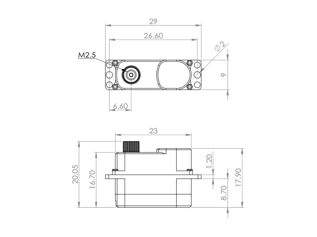 Velmi silné a rychlé programovatelné tenké digitální mikroservo s titanovými převody uloženými na jednom kuličkovém, jednom samomazném a dvou jehlových ložiscích. Díky přesným předepjatým převodům s minimálními vůlemi a ploché krabičce s výškou 9 mm je zvláště vhodné pro ovládání křidélek a klapek v RC házedlech F3K, malých větroních a motorových modelech s tenkými profily křídla, jako jsou F5D modely pro závody okolo pylonů. Pro dokonalé chlazení i při vysokém zatížení je servo uloženo v hliníkové krabičce s patkami pro montáž na plocho.