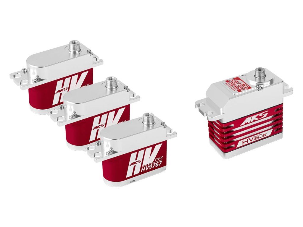 Combo set miniserv/standardního serva pro vrtulníky velikosti 550-600 obsahující 3x HV9767 miniserva pro cykliku a 1x standardní střídavé servo HBL990 (úzkopásmové 760µs) pro ocasní rotor. Kompatibilní s většinou 760µs gyroskopů a flybarless jednotek.