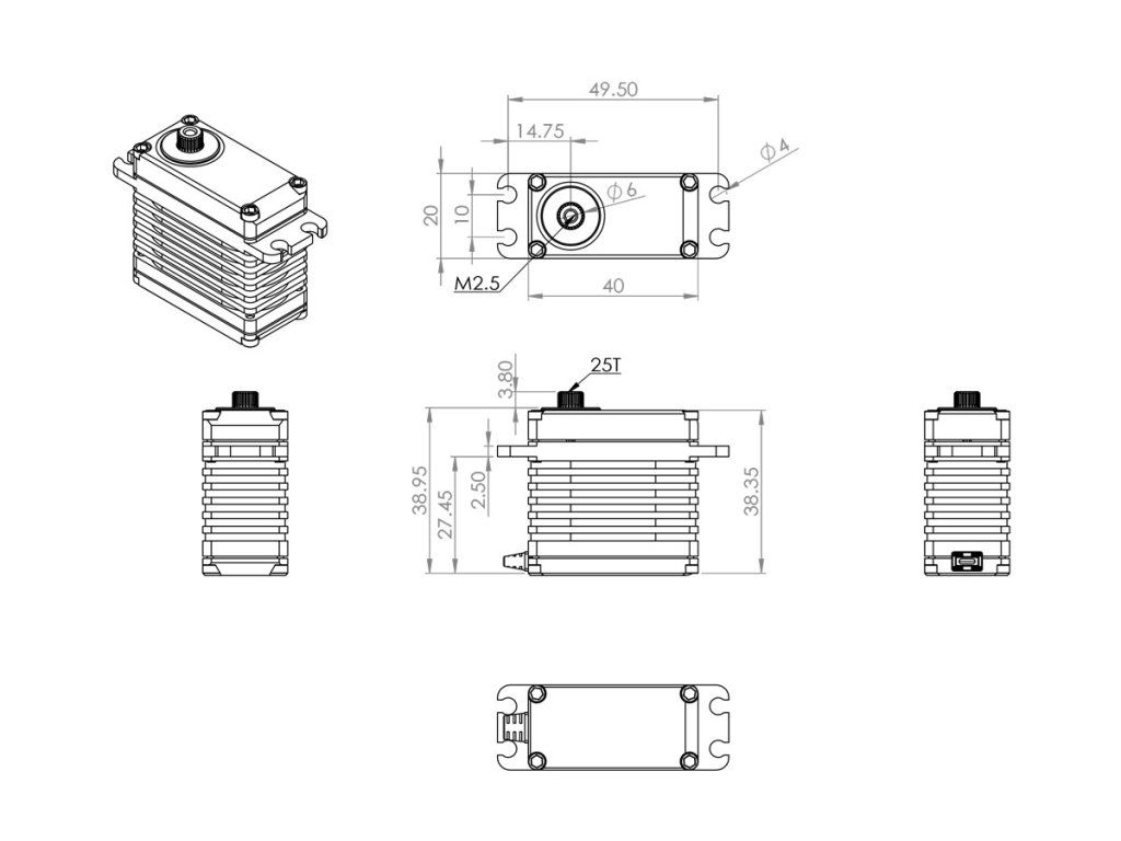 Velmi silné a rychlé programovatelné digitální standardní servo s kovovými převody a výstupní hřídelí uloženou na dvou kuličkových ložiscích pro všeobecné použití pro velké modely letadel. Pro dokonalé chlazení i při velmi vysokém zatížení je servo uloženo v hliníkové krabičce se žebrovanou střední částí.
