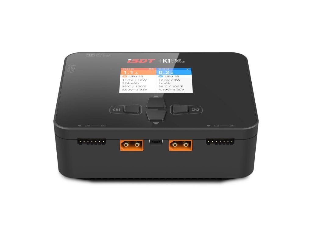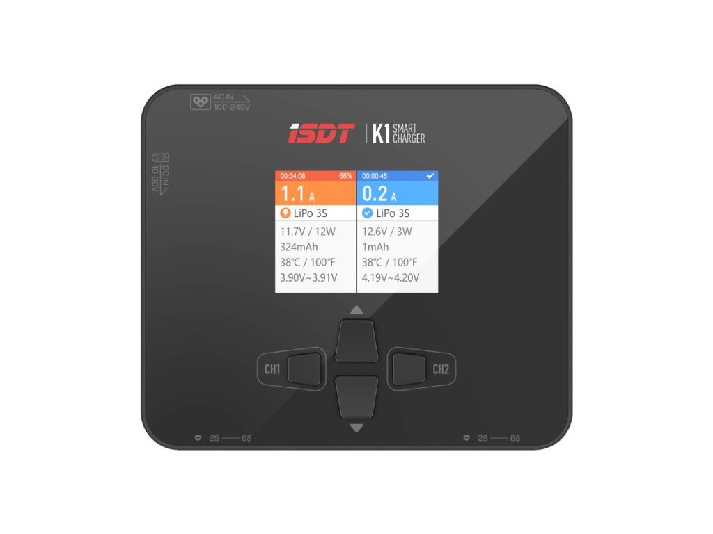 Malý dvoukanálový nabíječ ISDT K1 2x250W je inteligentní nabíječ s vysokým výkonem s napájením ze sítě i autobaterie a velmi jednoduchou a přehlednou obsluhou. K1 umožňuje nabíjet běžné typy článků (NiCd, NiMH, LiPo, LiHV, ULiHV, Li-ion, LiFe, Pb), navíc je vybaven vestavěnými šestikanálovými balancery, které zajišťují bezpečné nabíjení lithiových akumulátorů. Nabíječ je vybaven barevným LCD displejem a programovacími tlačítky, které vám poskytnou možnost komfortního a velice přehledného nastavování parametrů, řízení a sledování průběhu nabíjení.