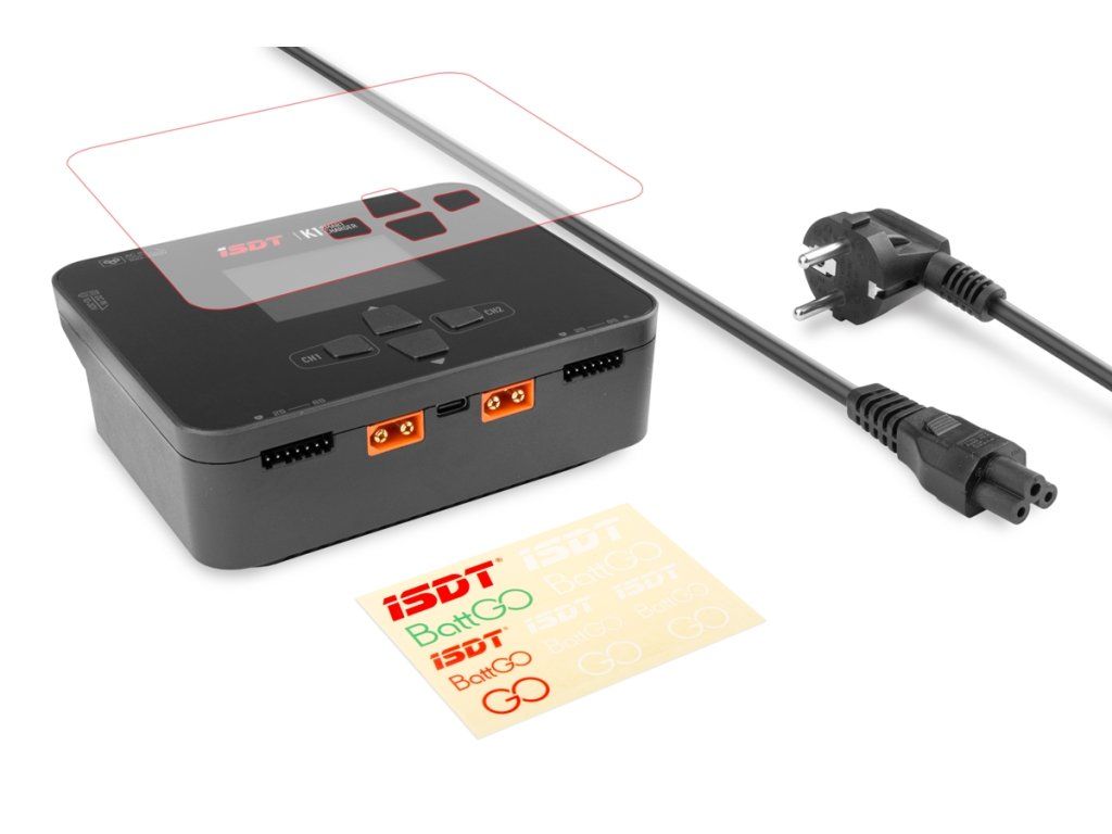 Sada nabíječe obsahuje: nabíječ ISDT K1, síťový kabel, chránič displeje, návod.